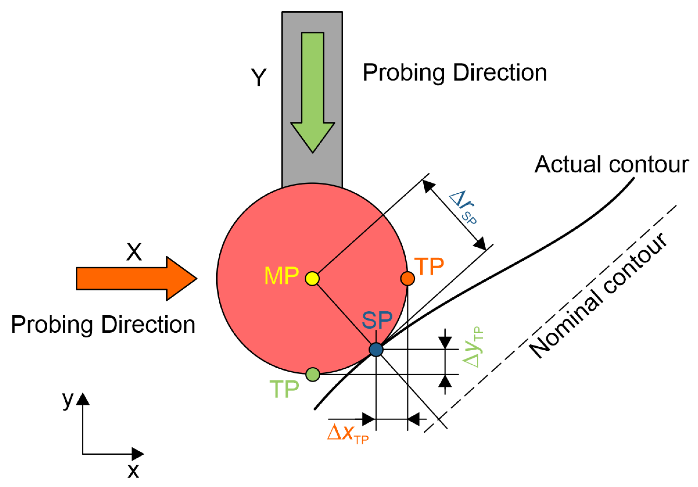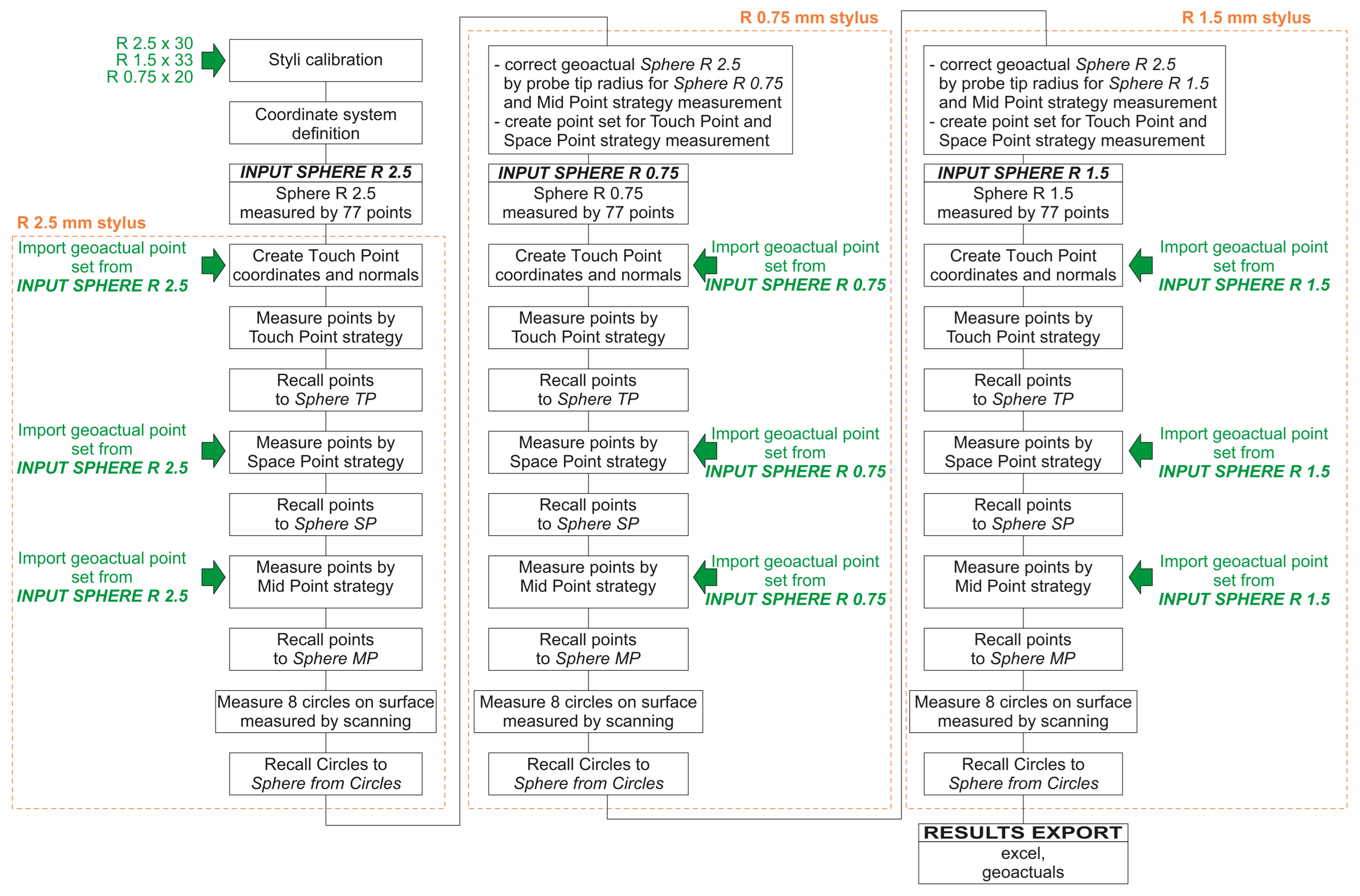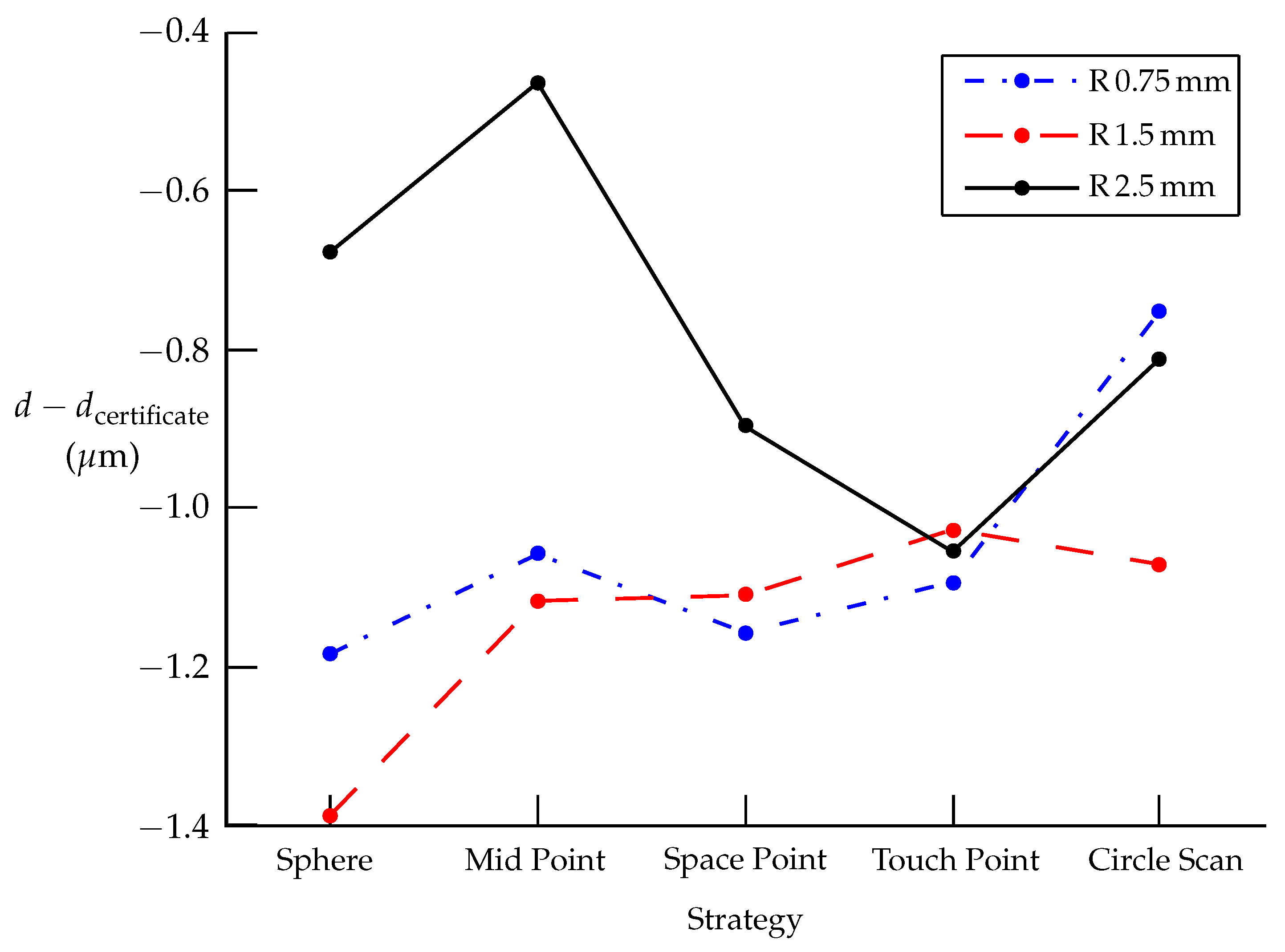 - In the experiment, new touch probes and an adapter plate were used to eliminate the effect of wear. The air temperature near the measured object varied by no more than 0.3 K during touch probe calibration and measurement. The differences for the individual probes and strategies are small. The smallest deviations were observed for the probe with mm using the Mid Point, Sphere, and Circle Scan strategies (see Table 5, Table 8 and Table 11, and Figure 7). The Touch Point strategy shows the smallest variance for the touch probes used (Figure 7).The differences are probably due to the influence of the stiffness of the sensing systems. The probe extensions are made of the same material and have the same thickness (diameter). The probe with mm has a shorter metallic shaft (diameter 1 mm), the probe with mm has a shaft with a diameter of 3.5 mm, and the probe with mm has a shaft with a diameter of 2 mm.
