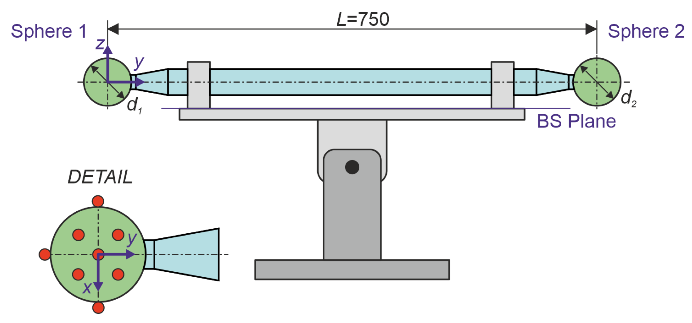- Sphere—Within the Sphere feature, points from the first measurement were used with coordinates adjusted according to the change in probe tip diameter , while preserving the normal vectors , . The Sphere feature was created using the LSQ evaluation method.