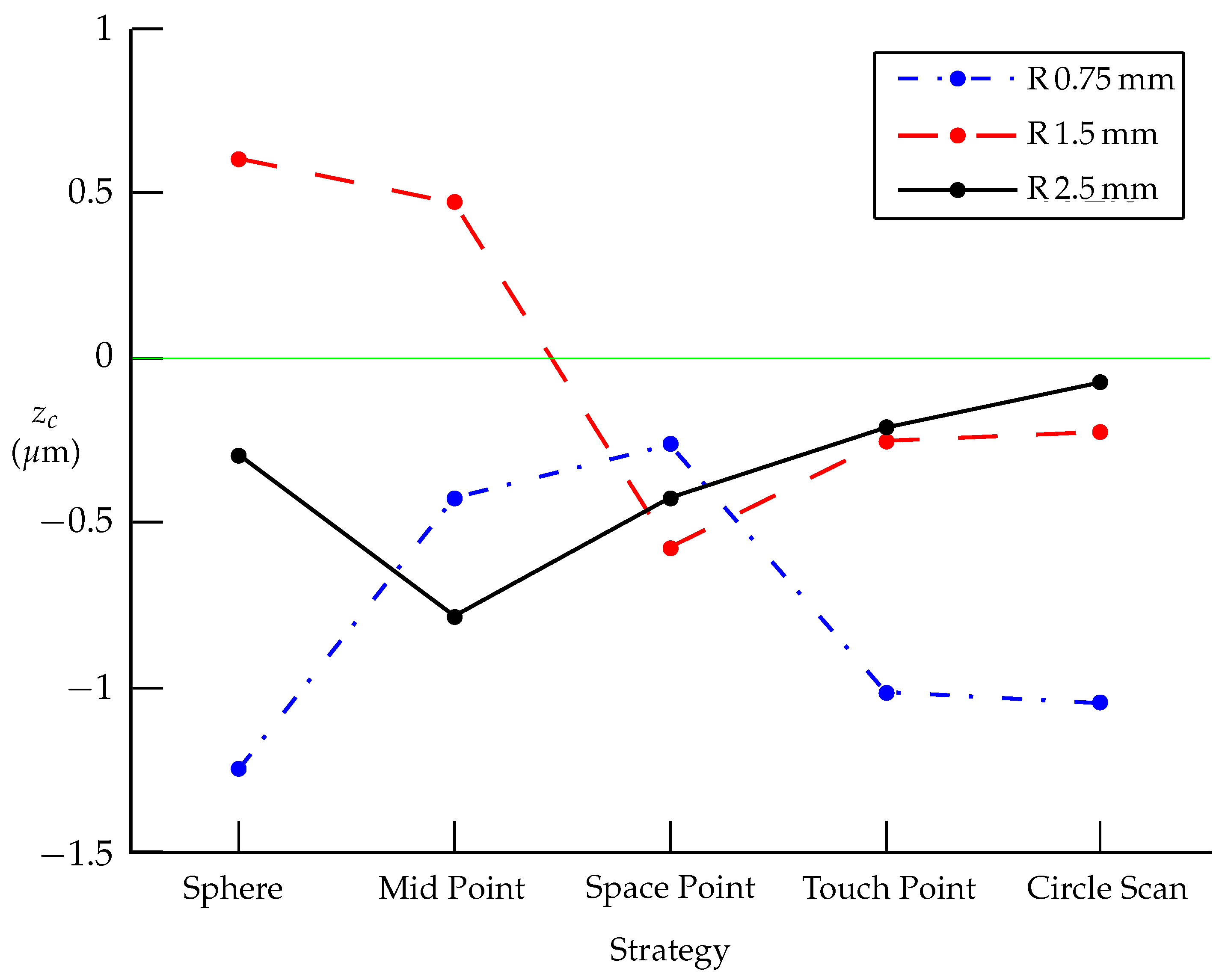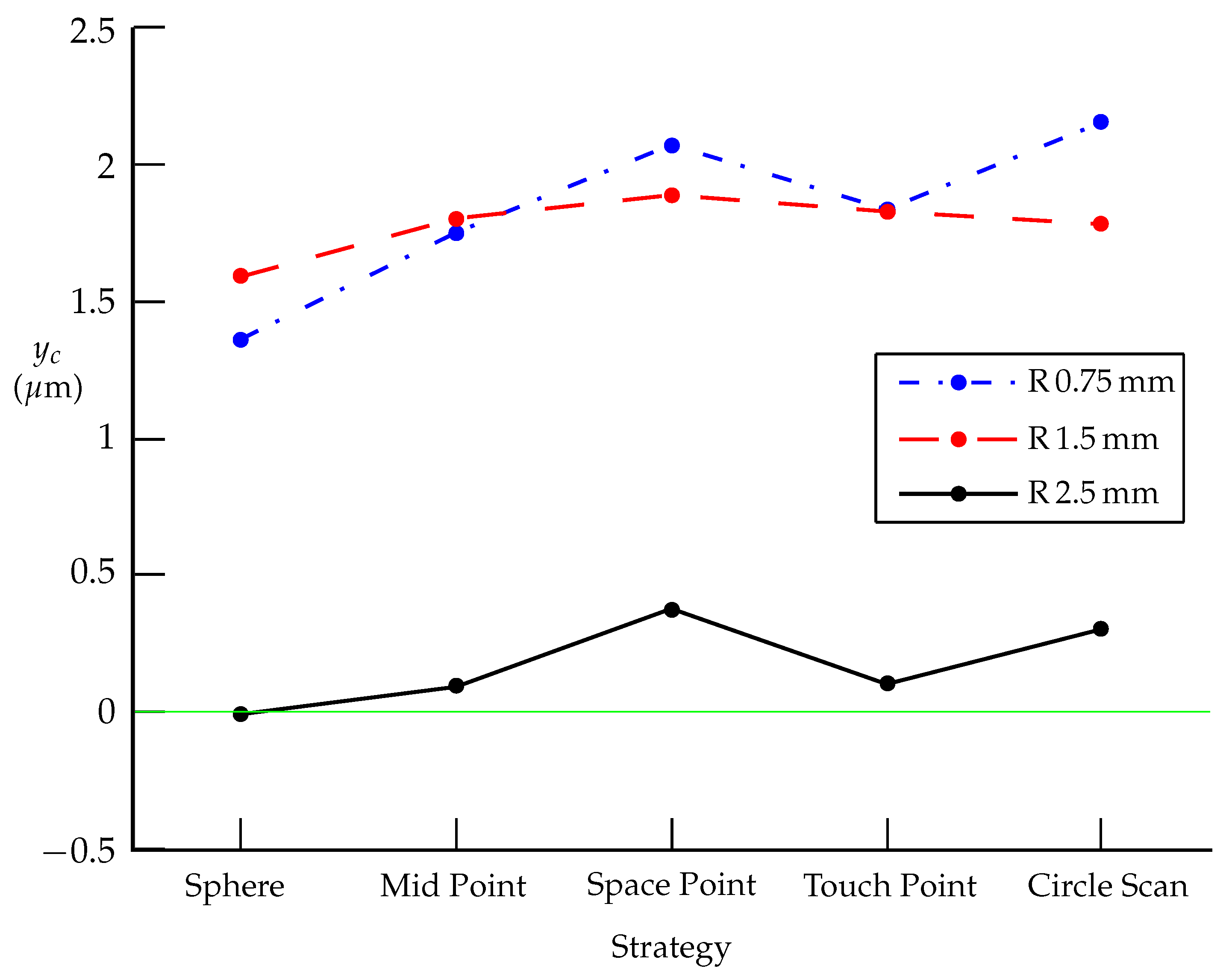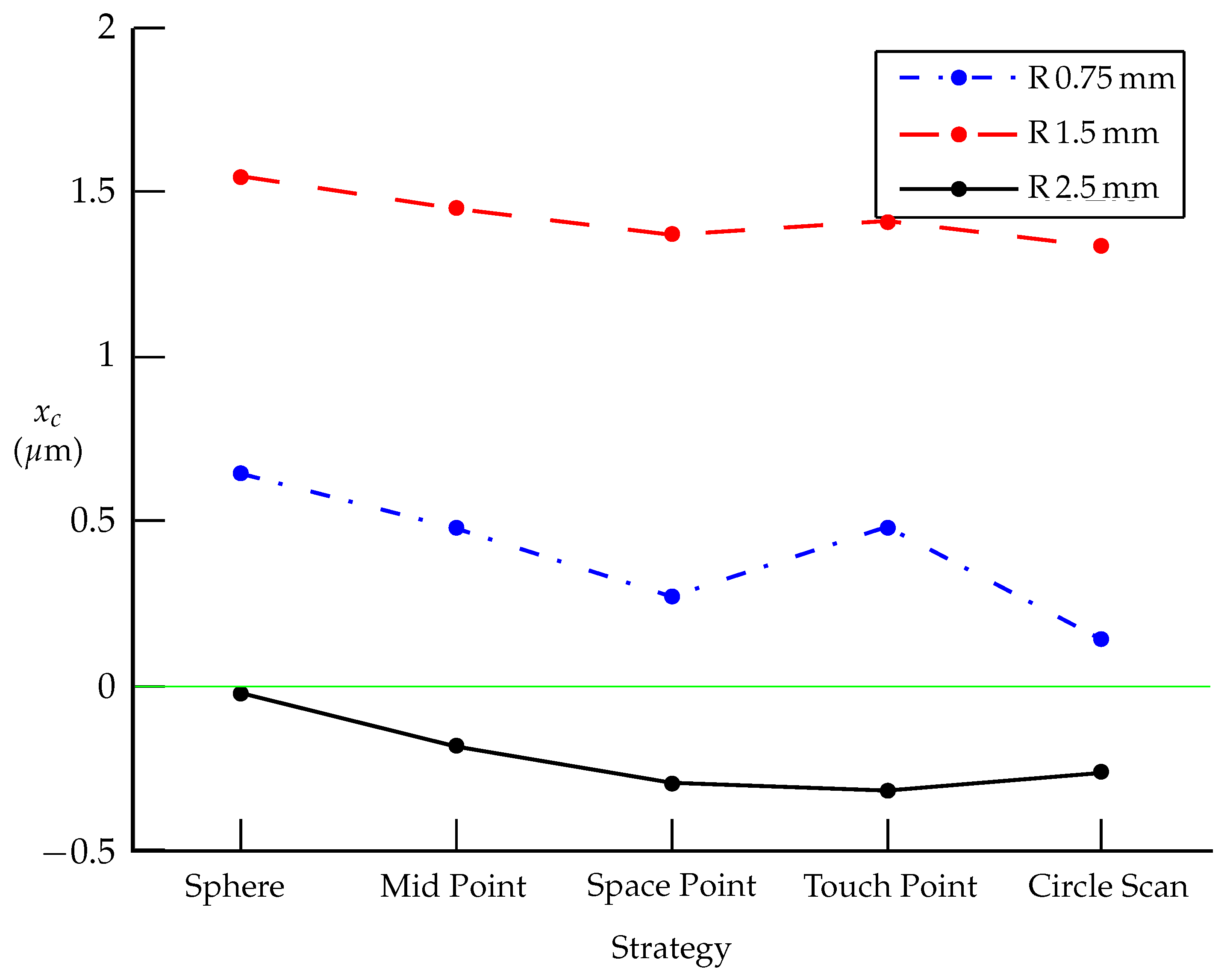 - The centers of spheres created from individual measurements depend on the evaluation method (LSQ, minimum feature) (see Table 4, Table 7 and Table 10), as well as on the elimination of outliers and data filtering. Figure 8, Figure 9 and Figure 10 show the position of the evaluated center for different probe radii and strategies. It is evident that for measuring the diameter and center of the sphere, the probe with a radius of mm provides the best results for all coordinates, while the mm probe gives better results for the and coordinates than the mm probe. The results are consistent with [14,15].
