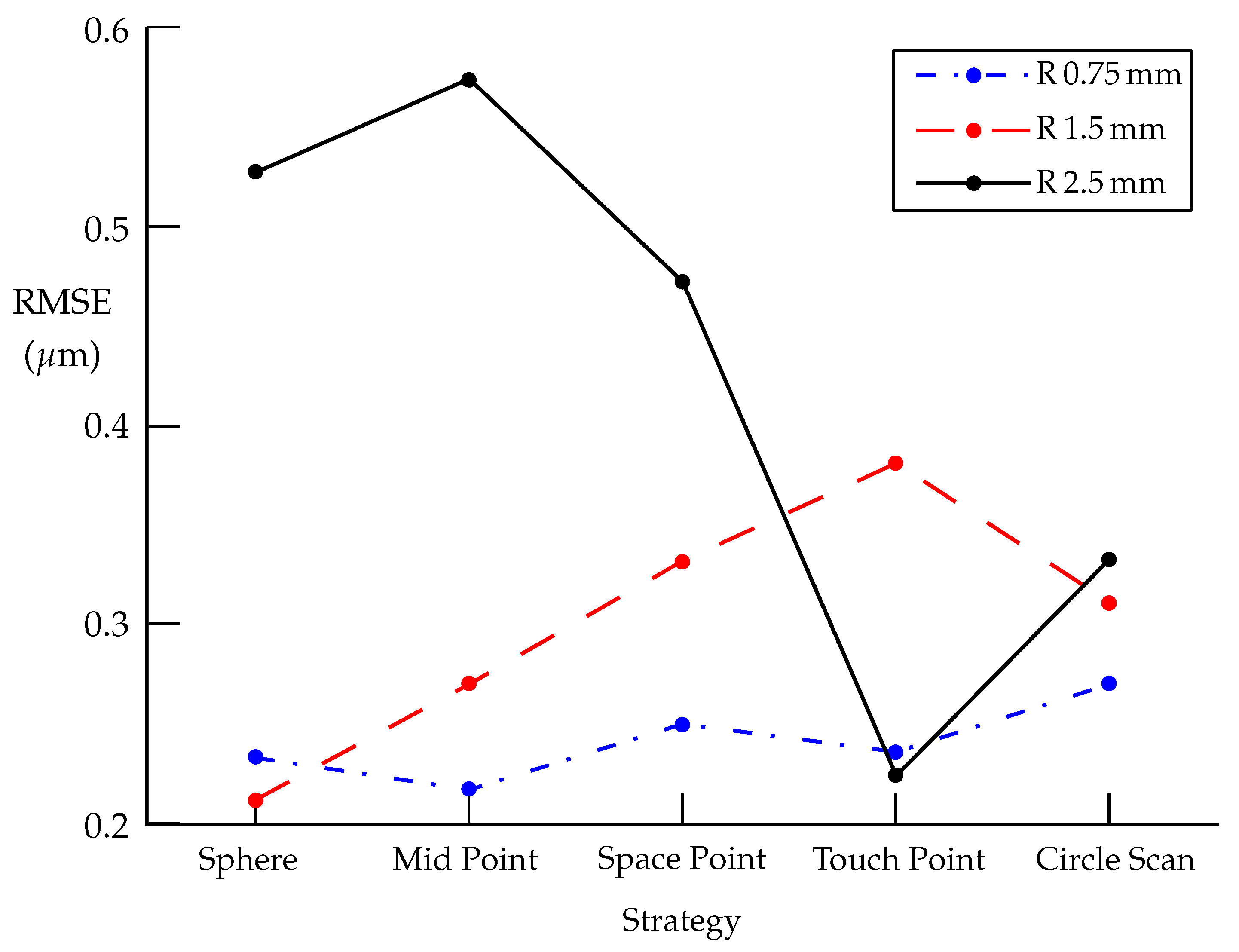 - The smallest RMSE values (Table 3 and Figure 11) and their variation ranges (VR) for the strategies Sphere, Mid Point, Space Point, and Touch Point were achieved for the probe mm, where the RMSE was at most 0.25 m and the variation range was 0.033 m. For the Kåsa/Newton method, RMSE values are always less than 0.575 m ( mm, Mid Point). These results also correspond to the half-width values from Calypso (maximum 0.532 m, VR 0.099 m) and Form 2 (maximum 0.463 m, VR 0.079 m).