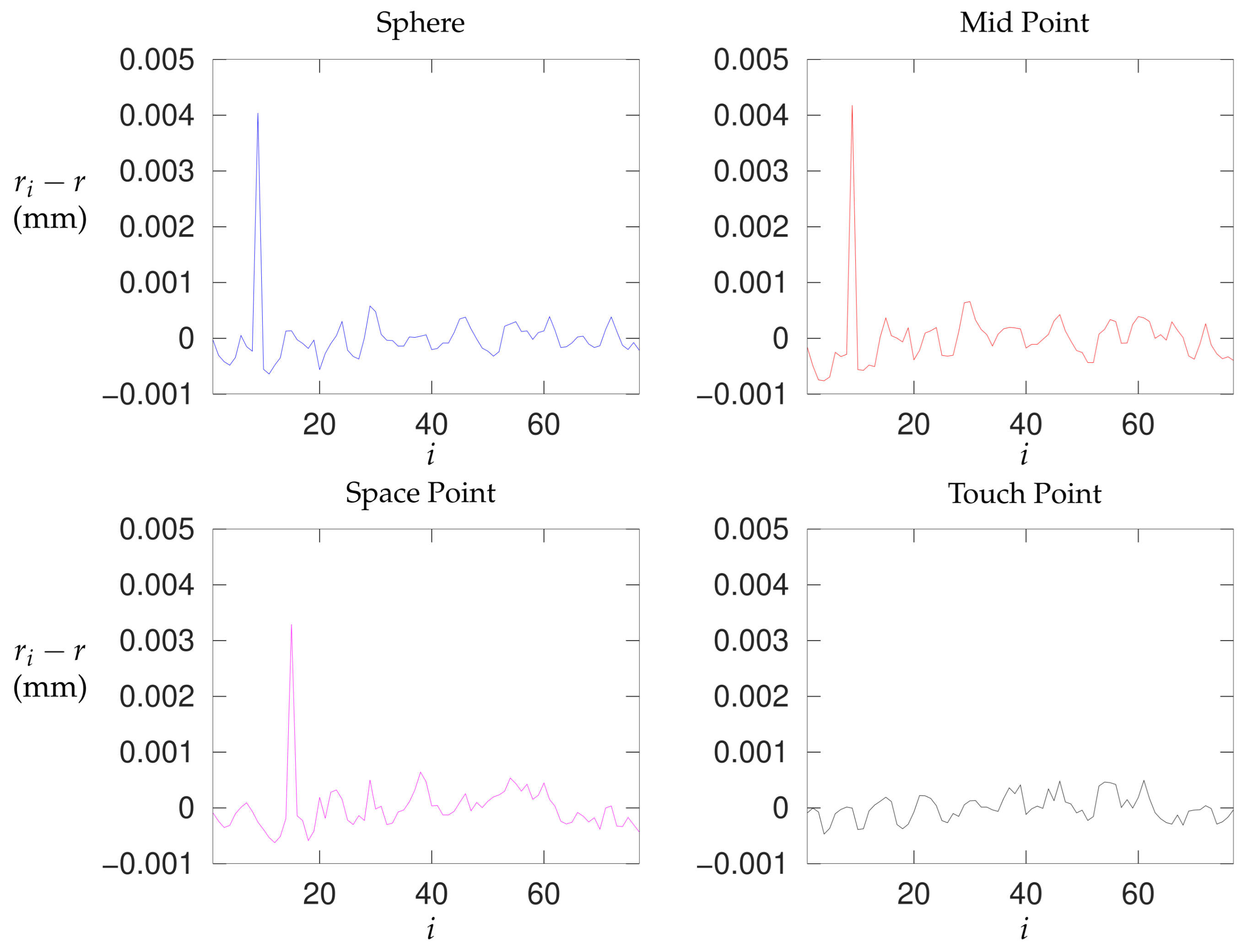 - Figure 12 shows the differences between the radii defined in (4) and the calculated radius r, for , …, 77, for four measurement options for mm. The Sphere and Mid Point datasets contain the extreme point , and the Space Point dataset contains the extreme point —so only one point in each of these cases causes the large half-width values in the corresponding rows of Table 3. Removing this point leads to smaller RMSE values; however, and become larger (see Figure 13 and Table 11 and Table 13). Figure 14 shows a histogram of the differences for the Circle Scan option for all three probe radii. Several extreme values for each radius have been ignored; the number of points has been 2147 of 2151, 2203 of 2205, and 2244 of 2253, respectively, for probe radii , , and mm. We believe that the difference between the three distributions is insignificant.