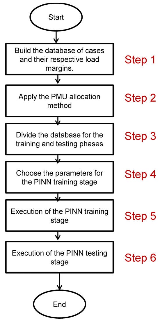 Thus, the proposed method for calculating the load margin differs from the methods proposed by the scientific community and already published in the literature. The PINN proposed for calculating the load margin has its weights determined in a training process with three loss functions. Two loss functions consider physical knowledge of the system associated with voltage stability, and one loss function considers experimental knowledge of the system. Furthermore, a procedure for selecting the buses to obtain PMUs is presented, and this procedure uses a voltage stability index that has already been applied to the system’s operating scenario database.