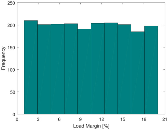 The PINN proposed in this paper was evaluated on an IEEE 68-bus system through case studies. This test system has 68 buses, 16 generators, 64 transmission lines and 5 areas, and the nominal case of this system is available in [67]. The complete differential algebraic model of the IEEE 68-bus system used in this research as a test system is detailed in the IEEE Technical Report [62]. From this nominal operating case, 2000 new operating points were obtained by varying the load levels of each load bus between 0 and 20%. The load margin of each of the 2000 operating points was obtained by applying the method described in [59] and assuming the load growth direction as all the system loads growing at the same rate. Figure 3 shows a histogram of the load margins of the database cases. The load margin of the cases vary between 1.0044% and 19.9701%, and the histogram proves a uniformity of load margins. From this database, 70% of the cases were applied for PINN training and 30% of the cases were applied for PINN testing. A comparative analysis was made with traditional Artificial Neural Networks considering weights and . Another machine learning technique called Graph Neural Networks (GNNs) [32] was evaluated comparatively in this research. It is worth noting that the method described in [32] only calculates the VSM associated with the voltage stability threshold. The method [32] does not calculate the load margin associated with the small-signal stability threshold. Furthermore, the Physics-Guided Neural Network (PGNN) developed by the authors of [49] was also applied, evaluated and discussed in this research. The authors’ PGNN [49] requires the reliable determination of the weights of two Neural Networks and needs the voltage and active and reactive power measurements of all buses in the system. The training of the authors’ PGNN [49] applies only two loss functions with equal weights.