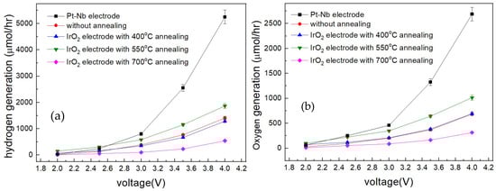 Figure 4a,b show the H2 and O2 production rates as a function of the applied voltage. For all samples, the H2 production rate is approximately twice that of O2, indicating the complete decomposition of H2O into hydrogen and oxygen. As shown in Figure 3, the gas production rate depends almost linearly on the current density. When the applied voltage is below 2.5 V, the gas production rate of the Pt-Nb sample is comparable to that of the 550 °C annealed IrO2, indicating similar performance between these two samples. However, when the voltage exceeds 3 V, the Pt-Nb sample exhibits the highest H2 and O2 production rates, while the 550 °C annealed IrO2 sample remains the best performer among the IrO2 samples. At 4 V, the 550 °C-annealed IrO2 sample produced approximately ~1800 μmol H2 and ~1000 μmol O2 per hour. This corresponds to about 44 mL h−1 of H2 and 22.5 mL h−1 of O2 at 25 °C and 1 atm. The low H2 production rate is likely attributable to suboptimal electrode pairing, wherein IrO2 is employed at both electrodes, thereby increasing the HER overpotential relative to Pt-based cathodes.