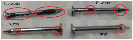 Surface corrosion of nails in different water samples. Red circles highlight corrosion areas.