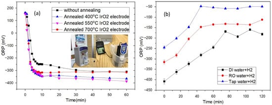 Figure 7a shows the ORP evolution during electrolysis using different IrO2 electrodes. The PEMWEs were integrated into a commercial water dispenser. In addition to the ORP meter, a dissolved hydrogen meter (ENH-1000, Trustlex Inc., Osaka, Japan) was used to monitor the H2 concentration in HRW, as shown in the inset of Figure 7a. Because the ORP signal often exhibited an initial transient with a highly variable peak during the first ≈ 30 s, the ORP reading was recorded only after approximately 30 s, once the value had stabilized. The most negative ORP observed was −515 mV using the IrO2 electrode annealed at 500 °C, at a dissolved H2 concentration of ~965 ppb; however, the value subsequently decreased substantially. According to the Nernst equation, a dissolved H2 level of ~965 ppb corresponds to an ORP in the negative 500 mV range, consistent with the measured value. For all samples, during the first 10 min of electrolysis, the ORP decreases sharply, followed by only a slight additional decline over the subsequent 50 min. After 1 h of electrolysis, the ORP values for the as-grown and 400, 550, and 700 °C-annealed IrO2 samples were −310, −366, −388, and −315 mV. The 550 °C-annealed IrO2 sample shows the highest current density (Figure 3), producing more H2; consequently, the dissolved H2 concentration increases and the ORP becomes more negative. Because dissolution of H2 in water is mildly exothermic, its equilibrium solubility decreases as temperature rises; warmer conditions therefore retain less dissolved hydrogen than cooler ones. After preparation, the dissolved H2 concentration decays as the liquid re-equilibrates with air’s extremely low hydrogen partial pressure, and the loss rate is accelerated by higher temperature, larger gas–liquid interfacial area, agitation, and permeable packaging. These temperature- and time-dependent losses of dissolved hydrogen shorten the practical shelf life of HRW.