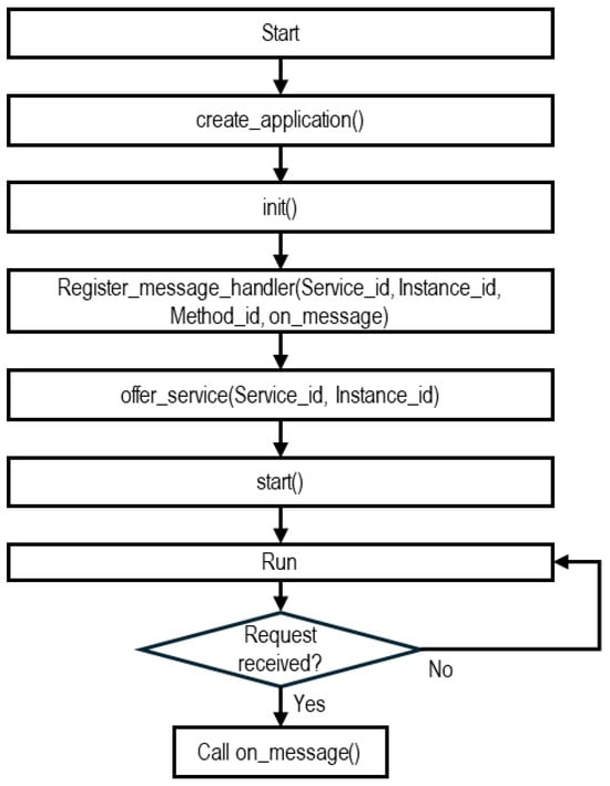 Figure 3 illustrates the flow diagram of setting up the vsomeip environment. After creating and initializing an application, the “register message handler” method is invoked. The last parameter of this method is a user-defined, application-dependent function. Given that only one method is employed in this work, a straightforward name was chosen for service execution. Nonetheless, in scenarios involving multiple methods and instances, this function’s name should ideally correspond to the specific method and instance required. This function is initially triggered when a matching service request is received by the service provider ECU. At this point, the SOME/IP runtime environment automatically executes this function to adequately address the request.