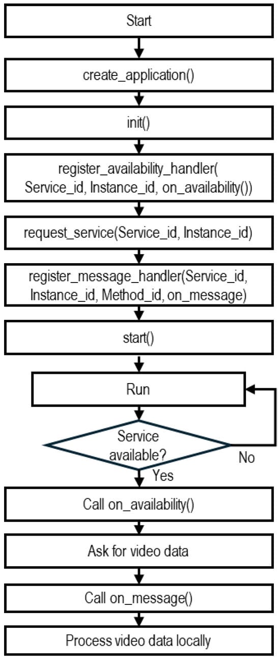 On the receiver side, which we will refer to as the “Client” from now on, similar steps are undertaken to create an application. However, unlike on the Server side, two distinct SOME/IP runtime methods are invoked before the register_message_handler method is triggered. These methods are register availability handler and request service. The former assigns a unique combination of service ID and instance ID to a user-defined and application-dependent function, which is activated as soon as the sought-after service is located anywhere on the network. In our implementation, this function is named “on_availability” due to convention, although more specific names may be necessary in scenarios involving multiple instance IDs, as previously mentioned. The latter method specifies the service and instance IDs in the SOME/IP runtime to initiate the SD protocol as soon as the application starts running. Subsequently, the SOME/IP SD protocol begins searching for this specific ID combination across the network. Finally, the register_message_handler method is invoked similarly to on the Server side. This method triggers an “on message” function to perform specific actions as soon as a packet is received from the Server. In this work, the packet contains video data, and thus this function encompasses the necessary steps for receiving, reading, and then storing this video in the Client’s memory. The workflow on the Client side is illustrated in Figure 4.