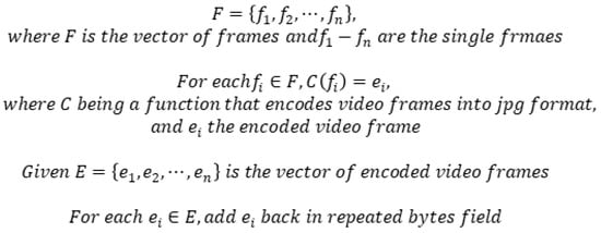 Subsequently, “.pb.cc” and “.pb.h” files are generated using proto compiler. These source files contain all the necessary classes and methods to populate the defined data types and read byte sequences into these data types. To convert a VideoData struct into byte sequences, a proto object generated by proto compiler is initialized to execute all the necessary operations. The “set” method, specifically tailored for our data structure, is used for each content element. The exception to this is frames, which must be handled differently because they are not a single variable but a vector of frames. For serializing a vector of video frames, a for-loop iterating through the frame vector is employed. In each iteration, an OpenCV function named “cv::imencode” encodes the current frame into a buffer in the form of a vector of “uchar” in JPG format, which stands for Joint Photographic Experts Group. This vector is then appended to the video frames field of the serialized message format using ‘add_elements’ method, where ‘elements’ stands for the name of vector field in ‘.proto’ file. The operation of adding video frames to the Proto class member’s repeated byte fields is summarized in Figure 9.