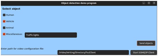 The GUI was designed to be simple, as it does not play an essential role in the project. However, it was also considered important that it could be replaced by a real object detection algorithm with as little effort as possible. Therefore, the flexibility to select multiple objects was added to the design, a feature typical of real object detection algorithms. In a real algorithm, there may be both pre-defined and undefined objects, thus, there is an option to categorize undefined or at least non-pre-defined objects under “miscellaneous”. For exemplary purposes, three pre-determined objects were defined: human, vehicle, and animal. These were chosen because the likelihood of detecting one of them in a vehicle environment is considerable. In the case of undefined objects, the text field next to the miscellaneous category must be filled, and then the string in this field is sent as an object. In addition to the user side of the program, there is a clock in the background that counts 100 s and then restarts. When the user selects a set of objects and clicks the “Send objects” button, the current timestamp is recorded, and the corresponding detection time is sent along with the selected objects.
