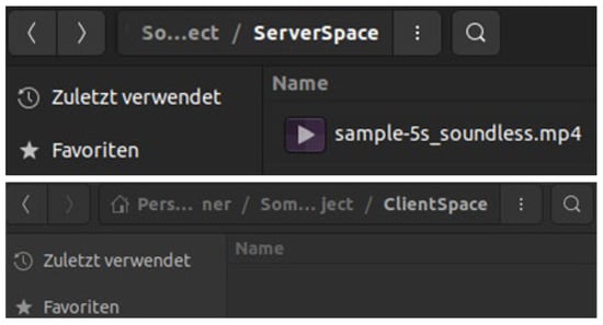 The video file selected to test the project is 6.9 MB in size, presenting a challenging workload for typical automotive communication protocols. This file was sourced from a website offering open-source training videos for machine learning-based systems. Initially, the video is stored solely in the Server’s memory. The second VM, referred to as the Client, has no direct access to this video. The directory structures for both VMs are provided in Figure 12.