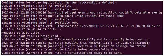 After establishing the initial environmental conditions, applications on both ends are launched. It is important to note that the launch order of the applications does not affect functionality, as both programs remain in a loop until the requested service is provided or a proper request is received. This is made possible by the service availability concept. Applications running on both ends constantly check for the availability of the services they require and remain on hold until those services are available. To monitor the communication between the VMs, console outputs have been configured to log each significant event, such as when the video service becomes available, a request is made, or video transmission is initiated. Figure 13 and Figure 14 illustrate some of the most significant log messages printed on the Server and Client consoles, respectively. Messages prefixed with ‘SERVER’ or ‘CLIENT’ are generated by our user functions called by vsomeip. Logs that begin with ‘Video service’ contain messages from our own video library. Lastly, console messages starting with ‘OpenCV’ are exclusively from the OpenCV library and are not influenced by our implementation.