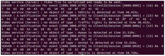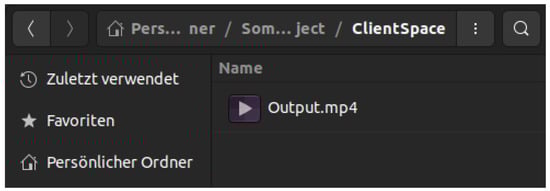 Following this operation, the previously empty directory on the client side, shown in Figure 12, appears as given in Figure 15. So far, only the results from the video transmission operation have been shared. After successful transmission of the requested video file, it is possible to send any number of event updates containing the so-called ‘detected objects’ using the GUI application. To demonstrate this, some arbitrarily chosen objects are sent as event updates to the server. A set of example objects, detailed in Table 5, are transmitted using the GUI application. The log messages that have consequently been printed out on the server’s console are illustrated in Figure 16.