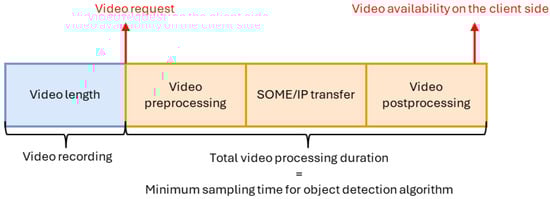 Since video data can be of any length, it is necessary to determine the duration of the video for this project. From this point on, this duration will be referred to as the “video section duration.” The time from when the video is requested until the video data is written to the client’s memory determines the sampling frequency of the object detection algorithm running in the client environment. This time will be referred to as the “total video processing duration” from now on. Important sections of total video processing duration are illustrated in Figure 18.