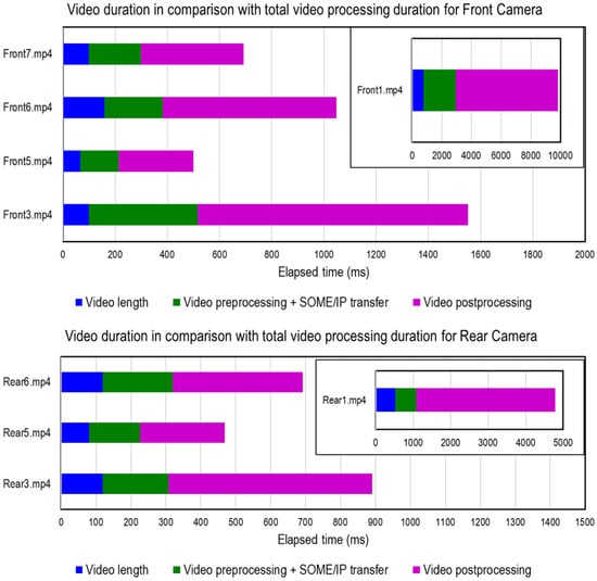 Figure 20 shows the total video durations in comparison with the video length for the front and rear camera video data. The longest processing times are observed in the Front1.mp4 and Rear1.mp4 video sections for the front and rear cameras, respectively. In the Front1.mp4 video, the total processing time is approximately 12 times the length of the video, rendering it unusable for practical purposes. In the Rear1.mp4 video, the total processing time is approximately 4.2 s, which is also highly impractical. To obtain values that can be used in practice, the video duration must be significantly reduced. Additionally, reducing the video resolution is necessary for the front camera to decrease the video data size. This affects not only the duration of video transmission but also file reading and writing operations. When analyzing the Front5.mp4 and Rear5.mp4 samples, it is seen that the total video processing duration remains around 400 ms.