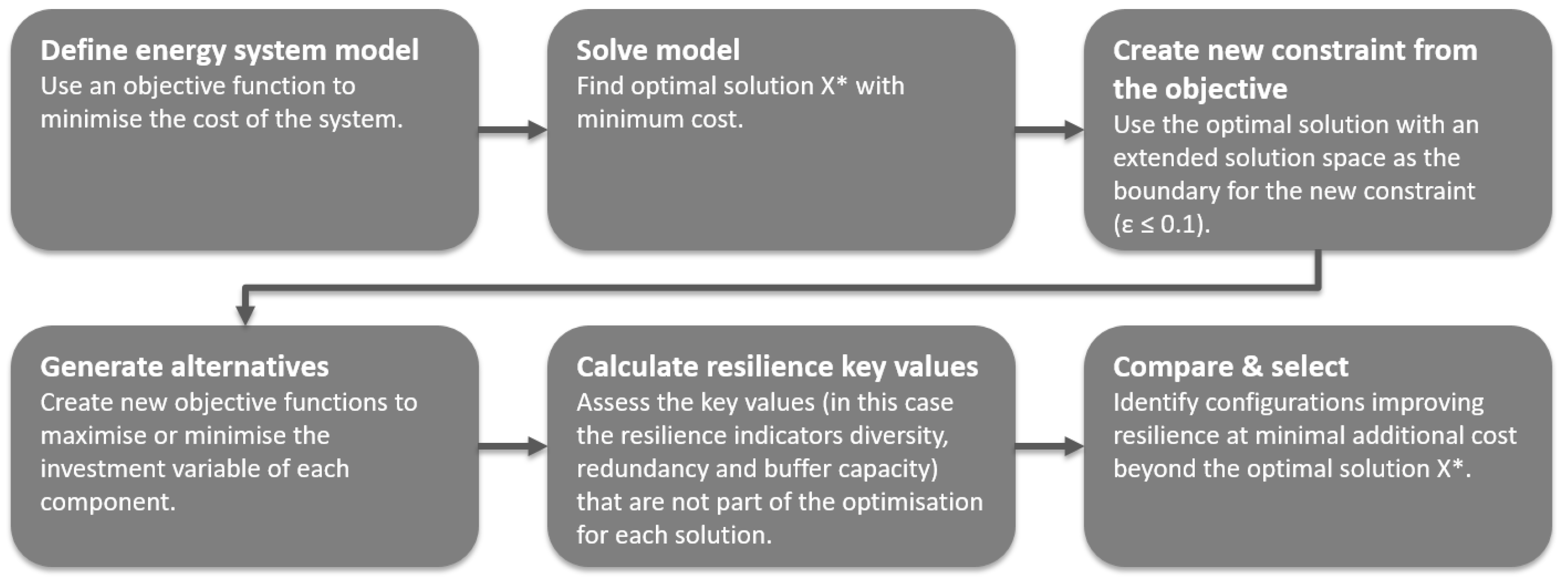To address the question of improving the resilience of future energy systems under near cost-optimal conditions, a methodology has been developed that can be divided into two main parts. Initially, the