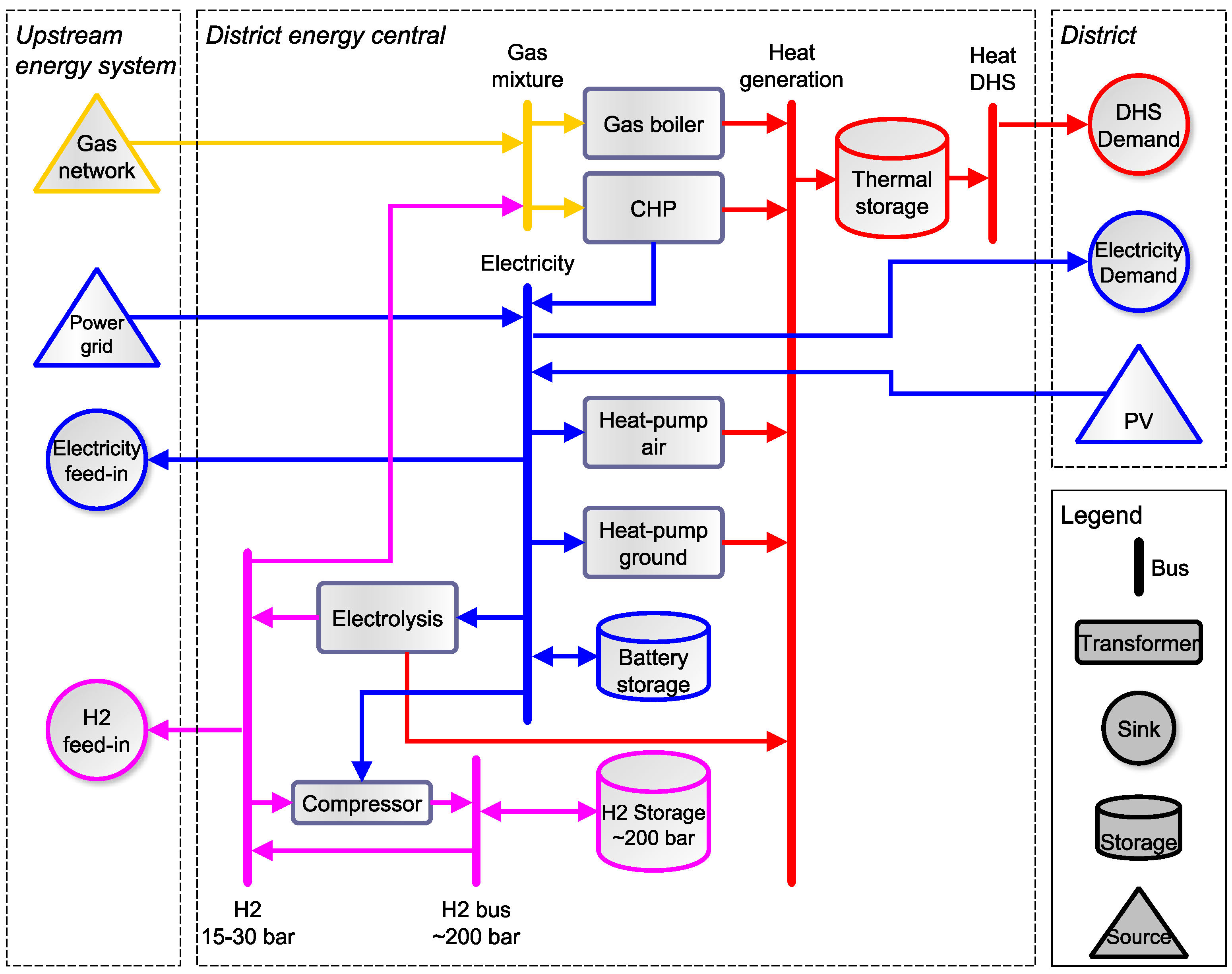 - Röder, J.; Meyer, B.; Krien, U.; Zimmermann, J.; Stührmann, T.; Zondervan, E. Optimal Design of District Heating Networks with Distributed Thermal Energy Storages—Method and Case Study. Int. J. Sustain. Energy Plan. Manag. 2021, 31, 5–22. [Google Scholar] [CrossRef]