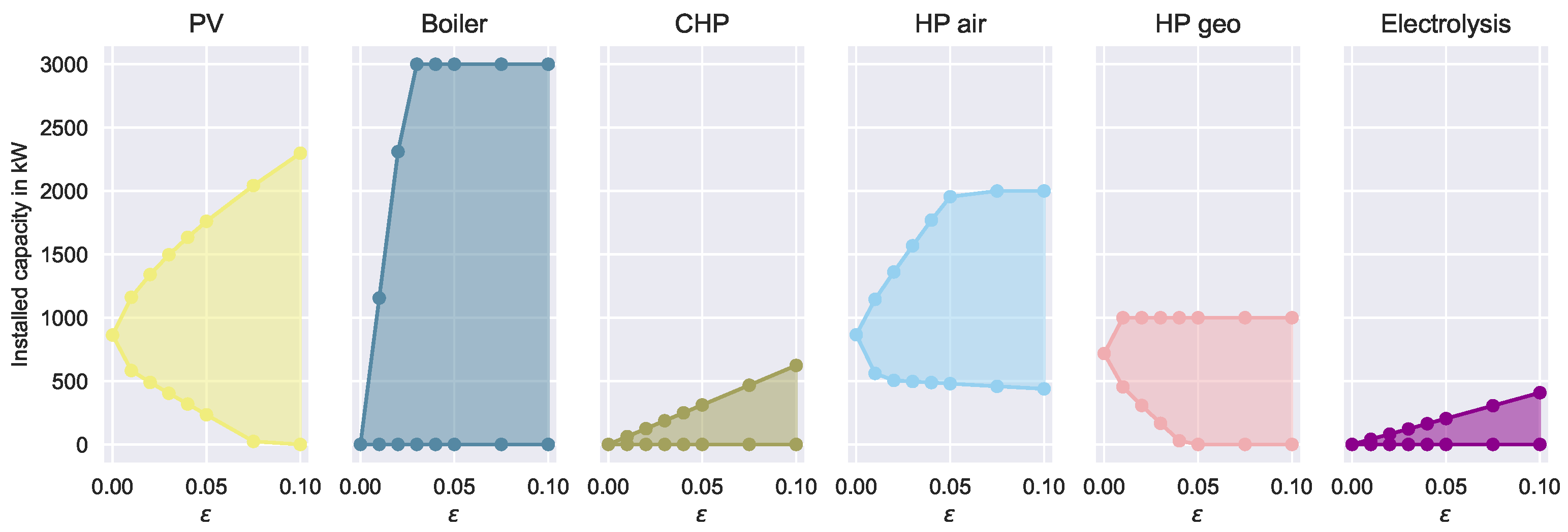 - Finke, J.; Kachirayil, F.; McKenna, R.; Bertsch, V. Modelling to generate near-Pareto-optimal alternatives (MGPA) for the municipal energy transition. Appl. Energy 2024, 376, 124126. [Google Scholar] [CrossRef]