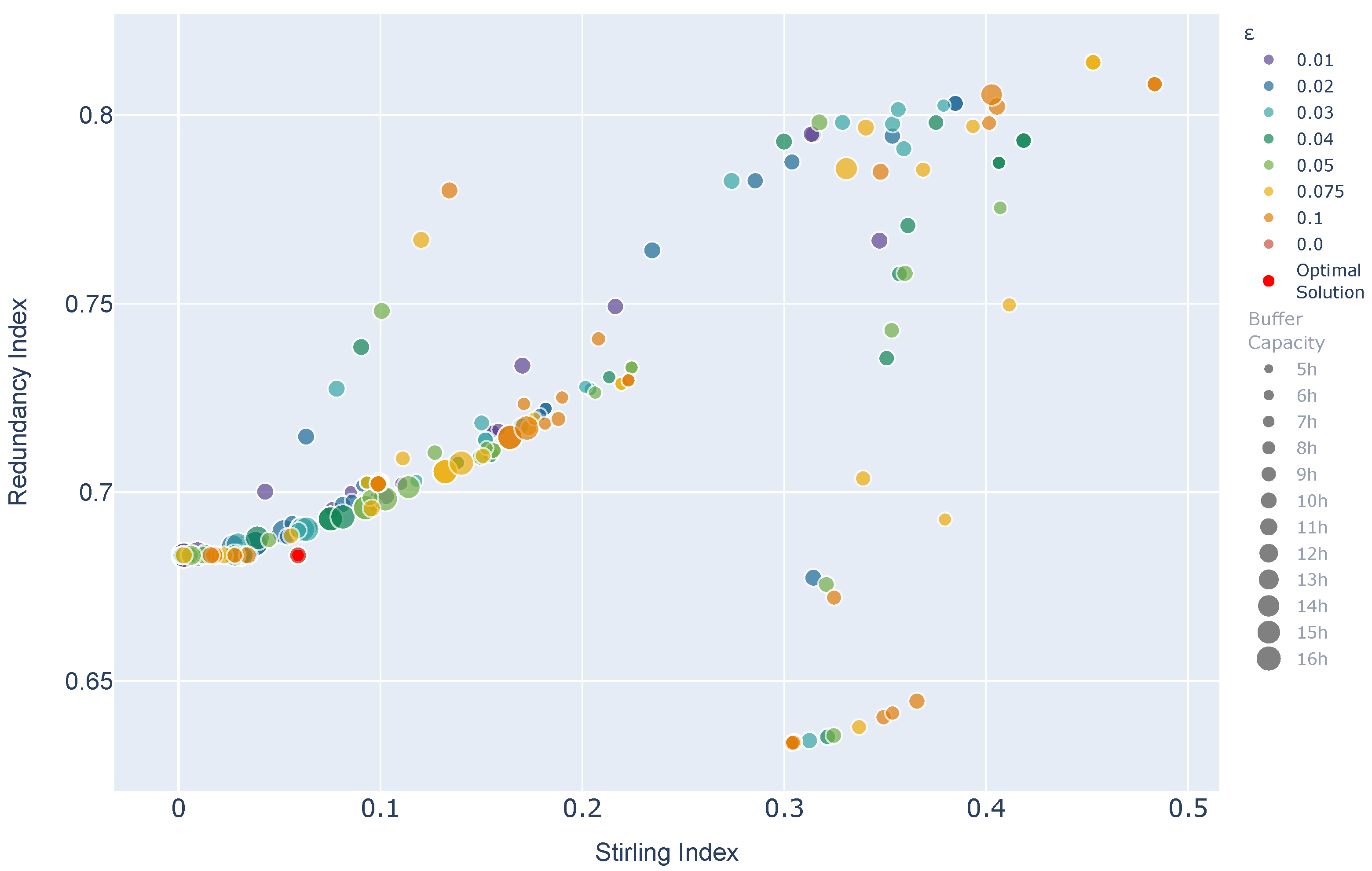 modelling to generate alternatives (MGA) optimisation approach is used to generate a set of near-optimal solutions. The variation in all investment decisions enables the generation of a wide range of different near-optimal solutions. This process leads to a large number of solutions that provide a comprehensive basis for identifying more resilient system configurations. For this reason, indicators for the resilience design principles of diversity, redundancy and buffer capacity are utilised to assess the resilience of this set of solutions.