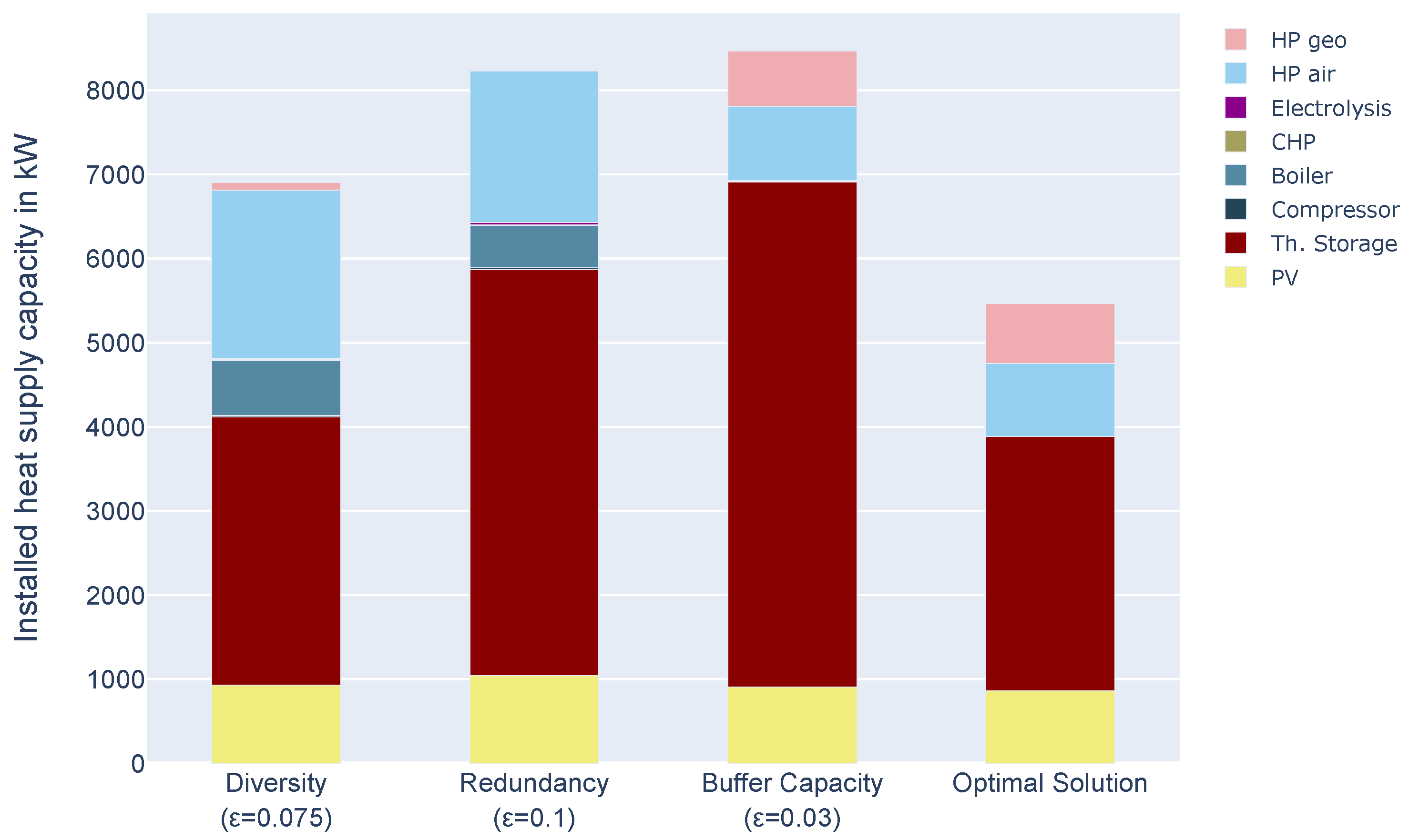 Conventional decision-making processes in the planning of heat supply are typically driven by cost considerations and only consider parameters of emission neutrality and security of supply as secondary conditions. Consequently, other relevant parameters, such as resilience, are often not taken into account, as a significant and unsustainable increase in costs is assumed. However, if the solution space is expanded, with slightly higher costs allowed for investment and operation, alternatives can be identified that are in the vicinity of the cost-optimal solution (defined as near-optimal solutions in terms of costs) but which perform significantly better than the optimal solution in other factors, such as resilience.