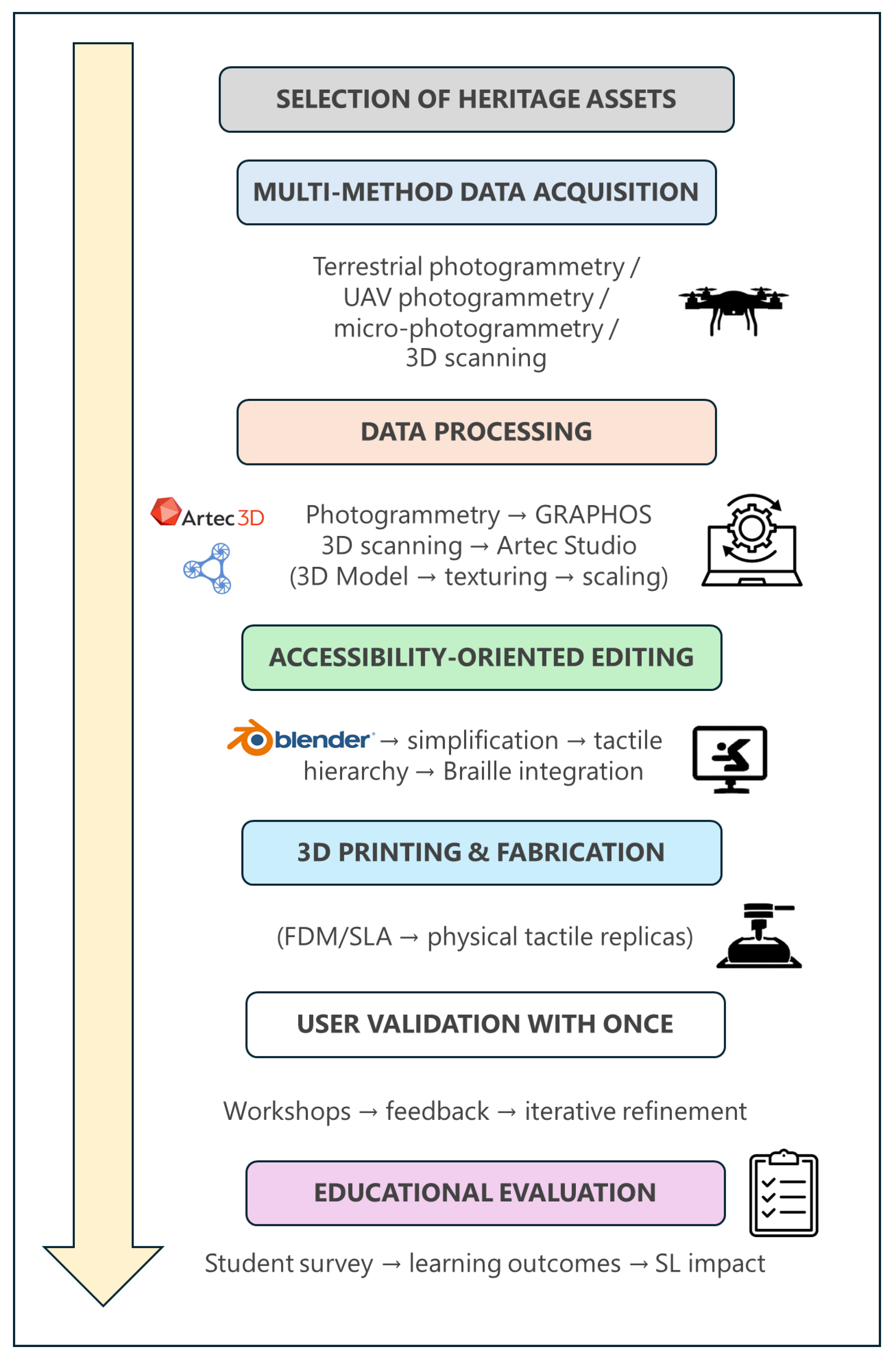 - Technical workflow. The project follows a structured workflow that begins with the selection of cultural heritage elements, considering their cultural relevance, technical feasibility, and potential accessibility for visually impaired users. Once selected, the assets are documented through data acquisition campaigns that combine terrestrial and aerial photogrammetry with high-resolution 3D laser scanning in the case of small artifacts. The digital data are subsequently processed, edited, and adapted in Blender v.4.2., ensuring that the resulting models meet tactile accessibility requirements by simplifying unnecessary details while preserving essential geometric features. To guide this adaptation, the teaching team worked with the recommendations provided by ONCE Ávila, which supplied the document “Technical Accessibility Criteria for Cultural and Natural Heritage for People with Visual Impairments” [39]. This reference served as a methodological framework throughout the project, offering practical guidelines on aspects such as the simplification of geometry, the use of textures to represent different materials, the appropriate scale for tactile exploration, and the inclusion of braille labels. These models are then materialized through 3D printing technologies, producing physical replicas designed for haptic exploration. The final outputs were subjected to a structured validation process involving visually impaired users in workshops coordinated with ONCE Ávila, thereby enabling the systematic collection of user-centered feedback on functional usability and accessibility performance. In parallel, the project also incorporates an educational evaluation phase: surveys are administered to the participating students and analyzed to assess both the acquisition of technical competences (photogrammetry, 3D modeling, and digital fabrication) and the development of transversal skills such as teamwork, empathy, and social responsibility.