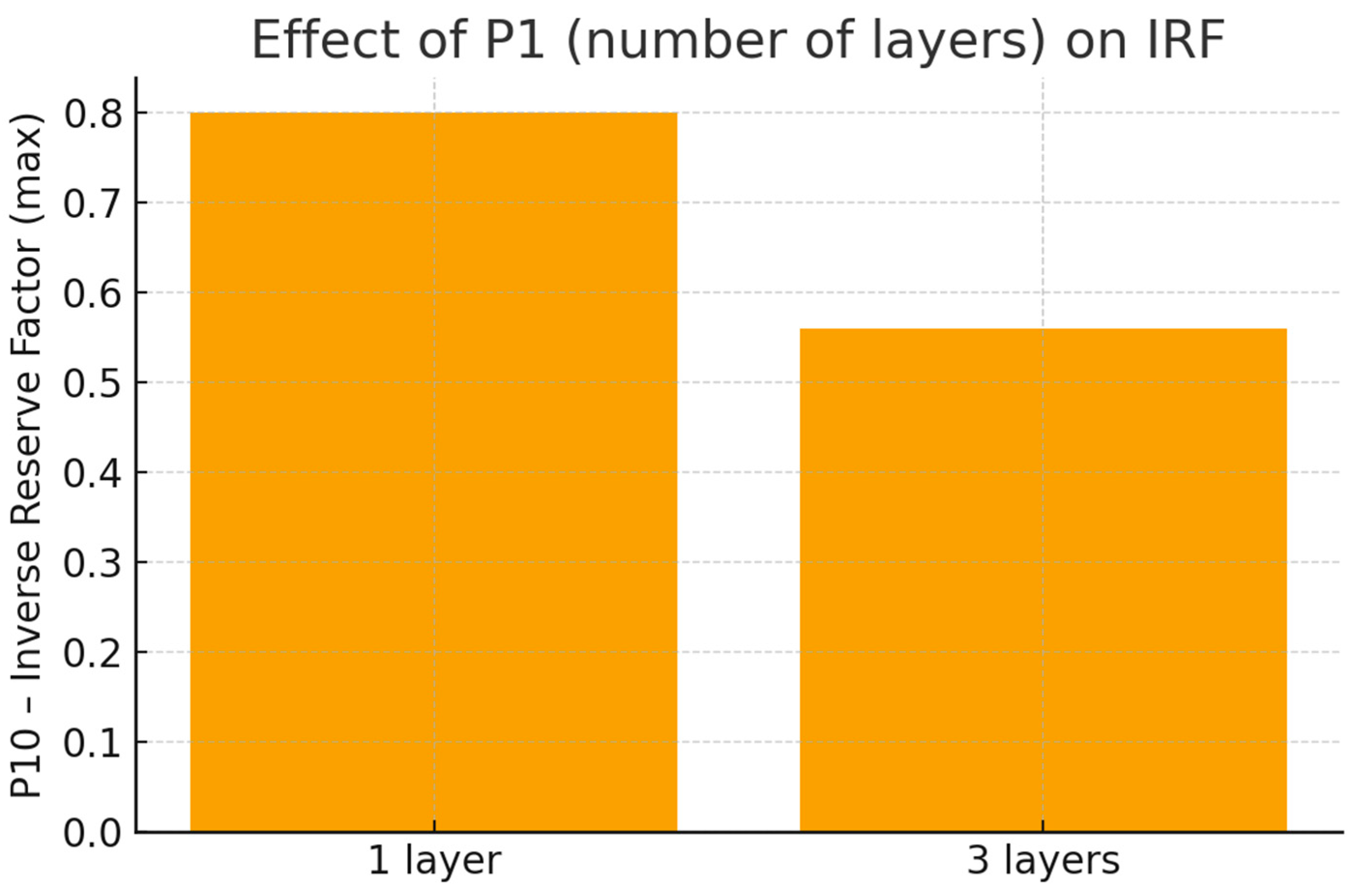 x-axis (number of layers = 1), the value of the Inverse Reserve Factor is much higher, close to 0.8. This means that the configuration for 3 layers has a greater safety headroom than a single layer.