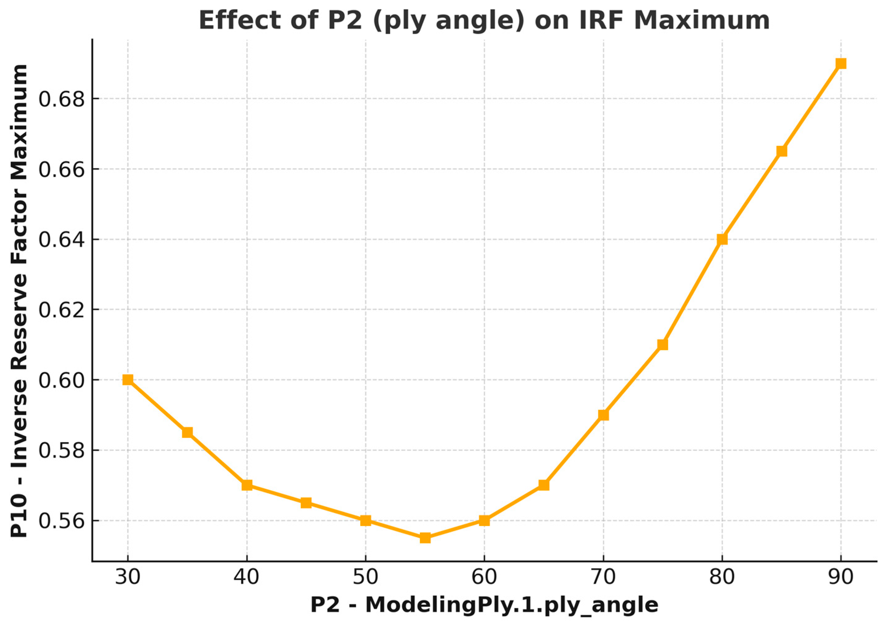 x-axis (P6—ModelingPly.3.ply_angle) represents the orientation of the fibers (ply angle), which varies from 30 to 90 degrees. The vertical axis represents the TDLM value. The value of the coefficient begins to increase rapidly, reaching its peak at an angle of around 80 degrees, where it reaches a maximum value of about 9.