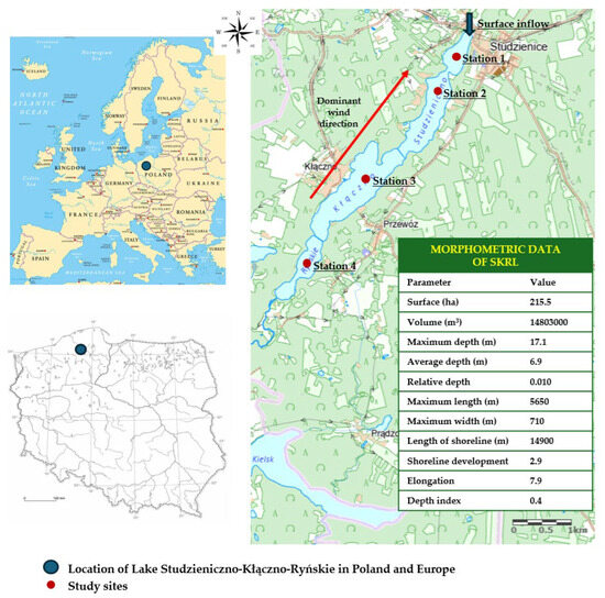 Studzieniczno-Kłączno-Ryńskie Lake (SKRL) with an area of 15.5 ha and a maximum depth of 17.1 m is located in the Pomeranian Lake District (northern Poland) at an altitude of 151.8 m above sea level [25]. The location of the lake is described by the following geographic coordinates: 54°04′4″ N and 17°32′8″ E. The lake is characterized by a convex bowl shape (depth index 0.4) with a capacity of 14,803 thousand m3. The analyzed lake is moderately deep in the ground, as evidenced by the relative depth value of 0.010 (Figure 1). It is an elongated water body stretching from the southwest to the northeast. The shoreline of the analyzed lake is 14,900 m long. It is moderately diversified, which is confirmed by the value of its development index (K) of 2.87 (Figure 1).