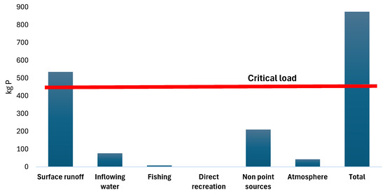 The permissible and critical load calculated for this lake from the Vollenweider hydrological model [16] are, respectively, 0.098 g P/m2/year and 0.196 g P/m2/year. This corresponds to a total amount of phosphorus of 211 and 422 kg P per year, respectively. This value may seem large, but the actual amounts reaching the lake are several times higher–874.1 kg of P. This means that the current impact of external pressures exceeds the critical load level twice. The long-term perspective of such loading will inevitably lead to a process of further eutrophication of the lake. Although this lake can withdraw a certain part of nutrients beyond its borders–surface runoff through the Kłoniecznica River (approximately 1102 kg of phosphorus and 9204 kg of nitrogen), the retention time of the inflowing water in the lake basin is too long for the pool of these nutrients not to enter the links of the lake’s food chain. The retention time is 1.58 years, which translates to about 80 weeks, while the life cycle of plankton is, on average, a dozen or so days. Therefore, nutrients supplied from external sources have a chance to cause mass phytoplankton appearances in the lake several times.
