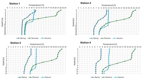 At the peak of summer stagnation, in the lake were noted thermal settings, typical of lakes in the temperate geographical zone. The epilimnion layer was 5 m thick and heated in the range of 20.3 to 22.7 °C (Figure 4). Below the epilimnion, there was a metalimnion with the highest gradient of 4 °C/m, which was recorded in the northern part of the lake, and a hypolimnion with temperatures varying from 7 to 9.2 °C. The lowest water temperature at the bottom in the summer was characteristic of the deepest part of the lake (Station 1). Strong thermal differentiation in the water column was reflected in the oxygen profile. Only in the epilimnion layer the oxygen concentrations were high and ranged from 7.4 to 10.5 mg O2/L (85–125% saturation), while in the upper metalimnion the amount of this gas dropped dramatically and in the northern part of the lake the water was deoxygenated below 7 m depth, and in the remaining parts of the reservoir below 10 m (Figure 5).