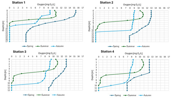 The surface layers of the northern part of the lake (Stations 1 and 2) were warmed to about 11 °C, and deeper down, the water temperature gently decreased to 6 °C at the bottom (Figure 4). At that time, at Station 1, the water layer up to 5 m depth was overoxygenated (from 114 to 142% oxygen saturation), and deeper down the oxygen content dropped rapidly to 3.8 mg O2/L (31% saturation) above the bottom. At Station 2, the water layer up to 7 m depth was overoxygenated (from 104.7 to 119% oxygen saturation, which corresponds to oxygen concentrations ranging from 12.3 to 13.0 mg O2/L), and deeper down the oxygen content decreased gently to 7.9 mg O2/L (65% saturation) above the bottom (Figure 5). In the southern part of the lake, the water was colder. At Station 3, the surface water layers were warmed to 9.5 °C, and with depth, the water temperature decreased gently to 6.6 °C at the bottom (Figure 4).