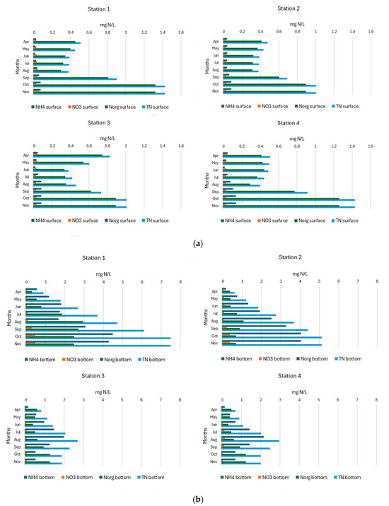 Organic nitrogen concentrations in SKRL water varied between 0.39 and 2.95 mg N/L (Figure 6a,b). The content of organic nitrogen in surface water layers increased continuously from spring to autumn. In the bottom water of the northern part of the lake (Stations 1 and 2), the amount of organic nitrogen increased from spring to the end of summer and then decreased, while in the southern part (Stations 3 and 4), similarly to the surface water, the concentration of organic nitrogen increased from April to November (Figure 6a,b). Statistical analysis showed significant differences in the content of organic nitrogen between the bottom water of the selected parts of the lake (Table 1). The deepest part of the lake (Station 1) was characterized by significantly higher contents of this form of nitrogen (Figure S1). The total content of nitrogen compounds in the studied lake varied widely between 0.38 and 7.50 mg N/L (Figure 6a,b). The bottom layers of water were much richer in nitrogen compounds, especially at Station 1, where the maximum values were recorded. In the surface water layers as well as in the bottom water of the northern part of the lake (Stations 1 and 2), seasonal changes in the concentration of total nitrogen consisted of a constant increase from spring to autumn. In the near-bottom layers of water in the southern part of the lake (Stations 3 and 4), concentrations of TN increased from April to September and later decreased in November. During the ANOVA analysis, which assesses whether there are significant differences in the mean concentrations of total nitrogen in the bottom layers of the water across individual parts of the lake, a Fisher’s F coefficient of 4.7 was obtained, with a significance level of p < 0.009. This result demonstrated highly statistically significant differences in the analyzed parameter between the different parts of SKRL (Table 1, Figure S1).