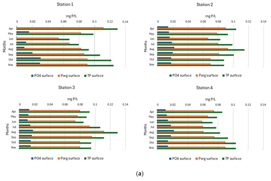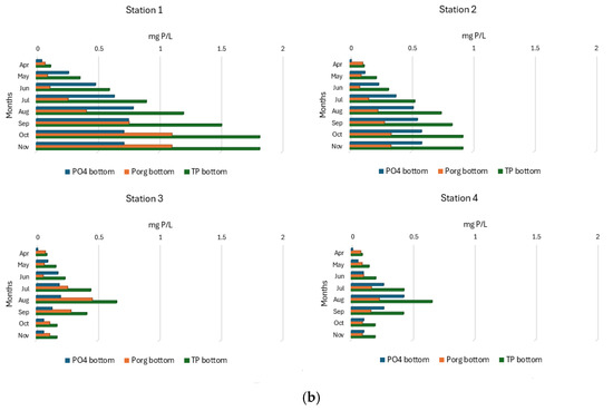 The total content of phosphorus compounds in the studied lake varied widely between 0.068 and 1.820 mg P/L (Figure 7a,b). The water layers near the bottom were much richer in phosphorus compounds, especially at Site 1, where the maximum values were recorded. No clear seasonal trend in the occurrence of total phosphorus was observed in the surface water layers of the studied lake. In the bottom water of the northern parts of the lake (Stations 1 and 2), seasonal changes in the concentration of total phosphorus consisted of their constant increase from spring to autumn, while in the southern parts (Stations 3 and 4), the TP content increased from spring to the end of summer and then decreased (Figure 7b). Statistical analysis of the data showed significant differences between the particular stations only in the bottom waters (Table 1, Figure S2).