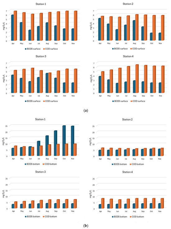 In the surface water layer of the SKRL, BOD5 values were moderate for most of the year and did not exceed 5 mg O2/L, while in the bottom water layers, the values of this parameter were much higher, reaching even 25 mg O2/L (Station 1, October) (Figure 8a,b). Seasonal changes in BOD5 values in the bottom layers of water consisted of their constant increase from spring to maximum values recorded in autumn (Figure 8b). This indicates that organic matter produced in the surface layers of the lake water during the growing season, after dying, sedimented towards the bottom and was deposited at the bottom of the lake, thus causing an increase in the value of biochemical oxygen demand. Statistical analysis of the data showed highly statistically significant differences in BOD5 values only in the bottom water of the particular parts of the lake (Table 1).