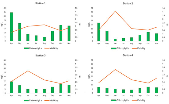 Chlorophyll a concentration in SKRL water ranged between 2.54 and 34.6 µg/L (Figure 9). The lowest average chlorophyll content at the level of 5.75 ± 1.4 µg/L was characterized by the shallowest, most southern part of the lake (Station 4), while the highest, 15.73 ± 9.8 µg/L, was the northern, deepest part (Station 1) (Figure 9). Statistical analysis of the data showed statistically significant differences in chlorophyll a content between the selected research stations (Table 1).