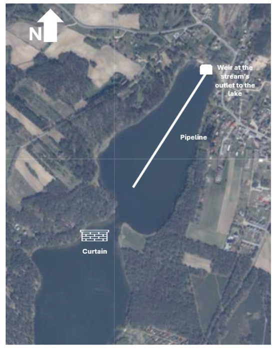 The method of lake renaturalization by controlling selective water outflow has been known in the literature for over 60 years, although examples of its practical application are still scarce. Poland is the country where this solution was first implemented on Lake Kortowskie [63]. In 1956, the natural outflow from this lake was blocked by a weir, allowing the water to be dammed to a depth of approximately 0.5 m, and the overfertilized hypolimnium waters were drained through a pipeline laid on the bottom sediments. Lake reclamation using selective hypolimnion water extraction has been used on several lakes in North America and Europe, including five lakes currently located in Poland [64]. The pipeline serves to improve oxygenation above the bottom and the nutrient balance in the reservoir. The method proposed for SKRL also utilizes selective control of water flow through the pipeline, but in the opposite direction. This innovative technique involves injecting surface water into the deep part of the lake, thus separating the nutrient load (nitrogen and phosphorus) and organic pollutants introduced with inflow water from the trophogenic (productive) zone. This solution limits the availability of nutrients to primary producers during the growing season. An additional aspect is the introduction of a certain amount of oxygen with inflow water into the bottom waters of the deep part, which is deoxygenated for most of the year, triggering internal fertilization. A similar method to the one proposed by the SKRL has been in operation for several years on Lake Łajs (Warmian-Masurian Voivodeship) and Lake Święte (Greater Poland Voivodeship).