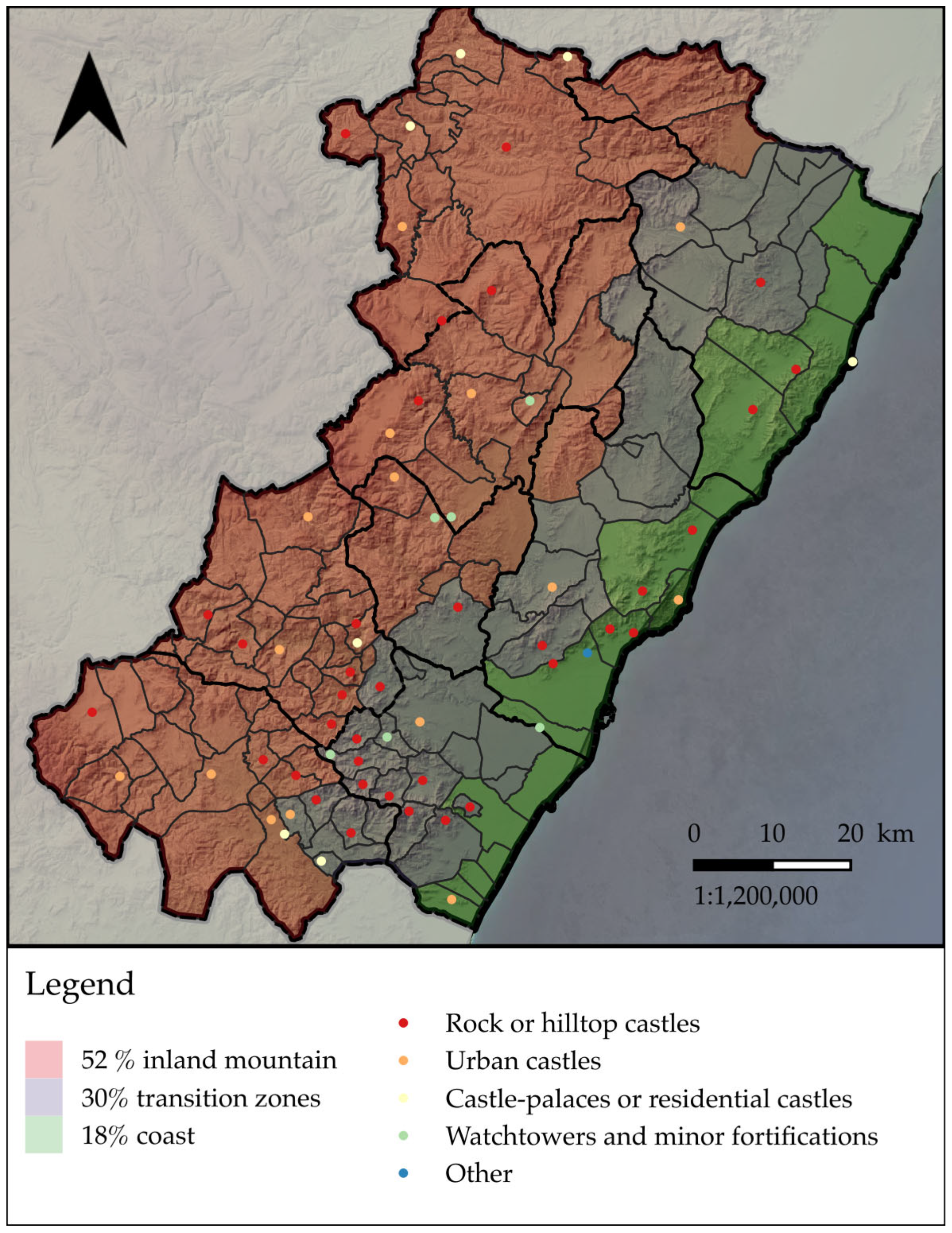 Figure 1). Its relief, straddling both the coastline and the mountains of the Iberian system, is reflected in its geographical duality, which has historically conditioned the location and significance of castles. The main role of coastal fortifications (watchtowers, batteries, and walled enclosures) was always to ensure maritime control, while fortifications found further inland were used to survey natural passes and agricultural valleys. This meant that, in turn, the inhabited space was interconnected through visual and symbolic systems [