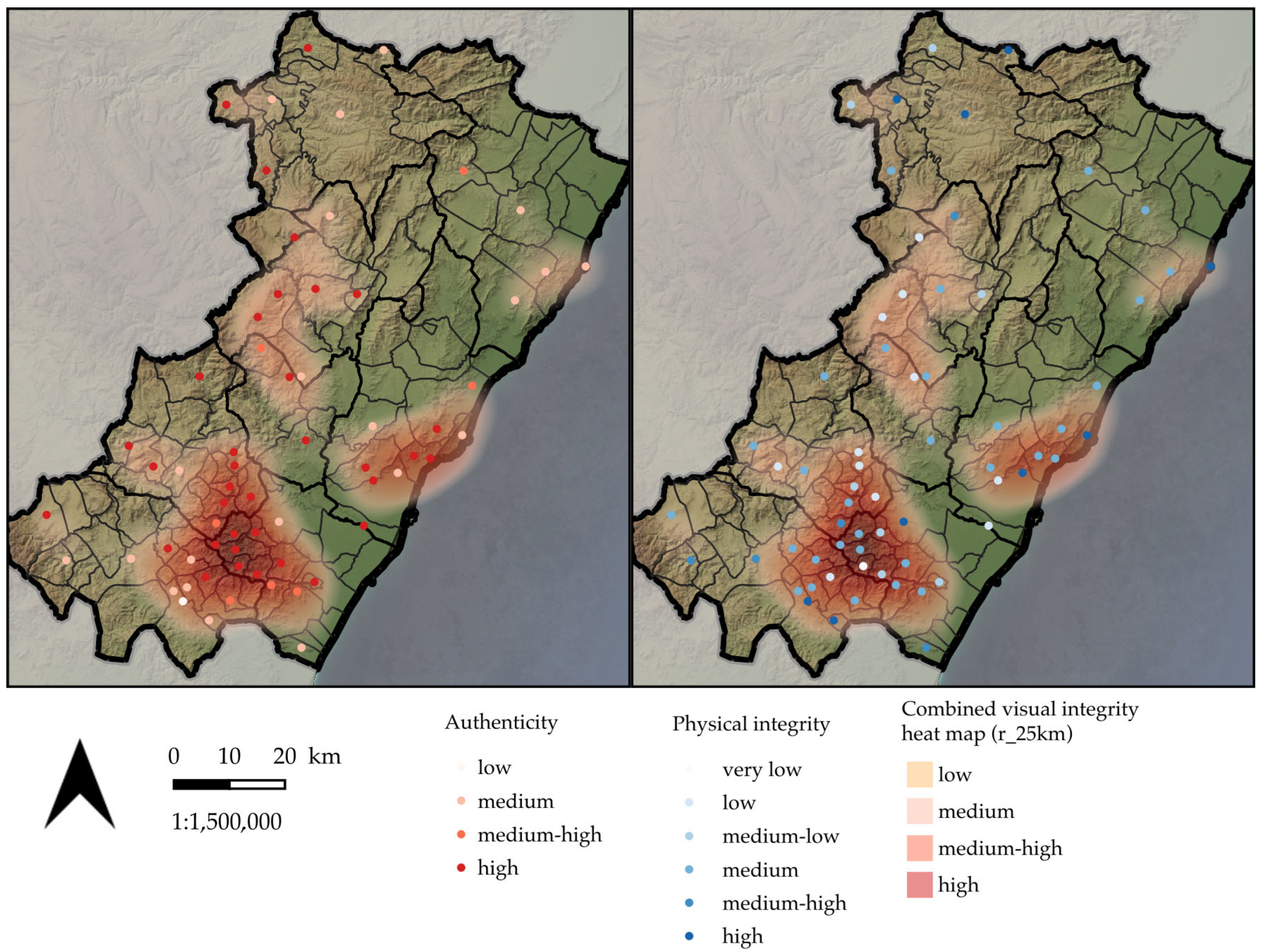21]. In combination, these values reveal patterns of conservation and landscape coherence using comparative analysis and cartographic visualisation. Spatial density and clustering were assessed through a combined approach, using visual interpretation of distribution patterns together with basic GIS-based metrics such as proximity and spatial dispersion indicators. In a move away from modelling-based interpretations, an interpretative approach was used, favouring a relational reading between architecture and territory without over-quantifying cultural phenomena.