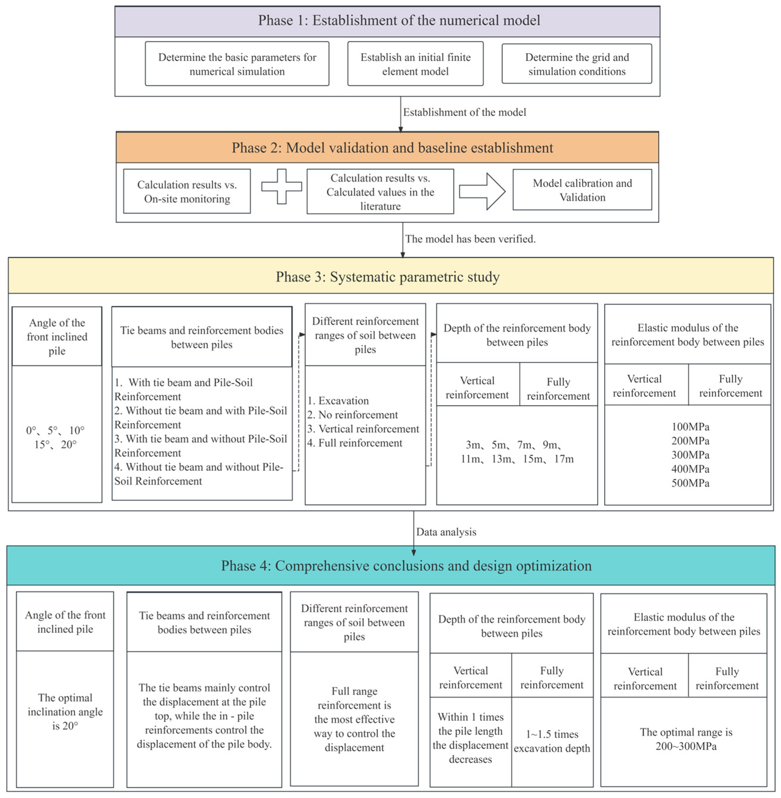 - Zheng, G.; Wang, Y.P.; Cheng, X.S.; Yu, D.H.; Huang, X.C.; Li, X.H. Field Experiment and Working Mechanism of Foundation Pit Excavation Retained by Front-row Inclined Double Row Piles in Soft Soil Area. J. Yangtze River Sci. Res. Inst. 2024, 41, 98–105, 113. [Google Scholar]