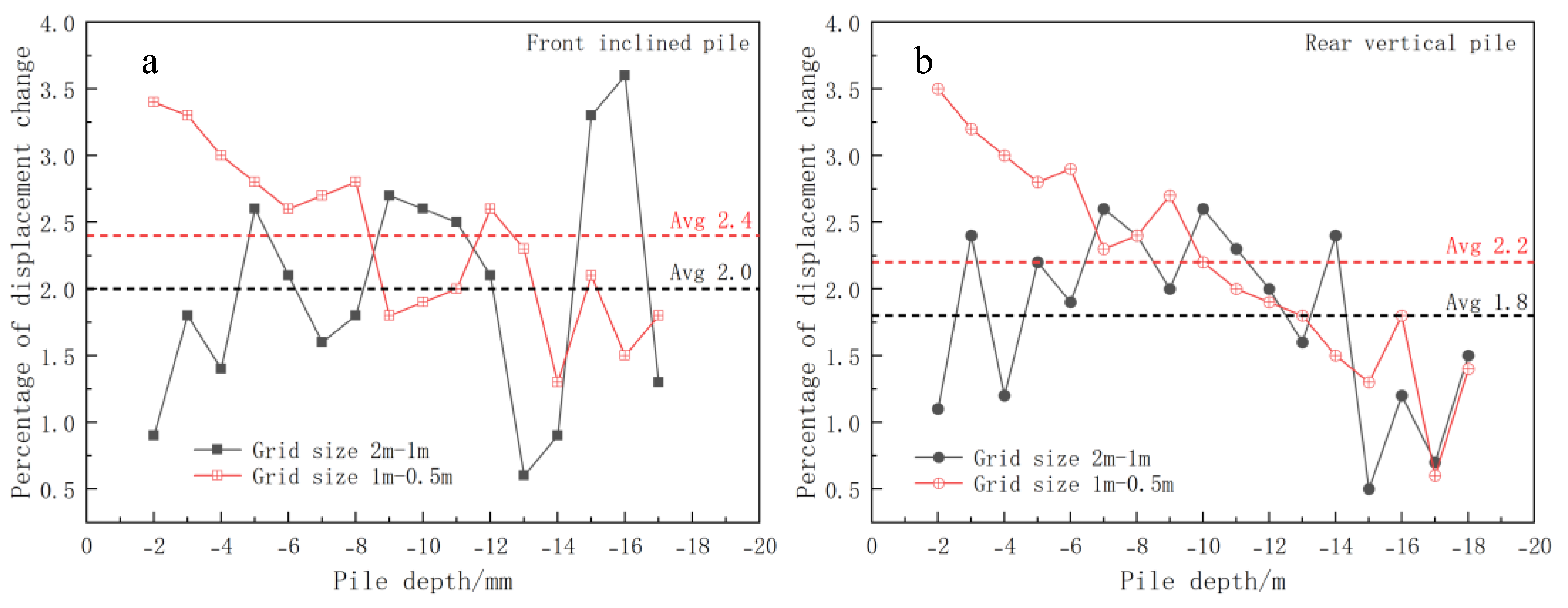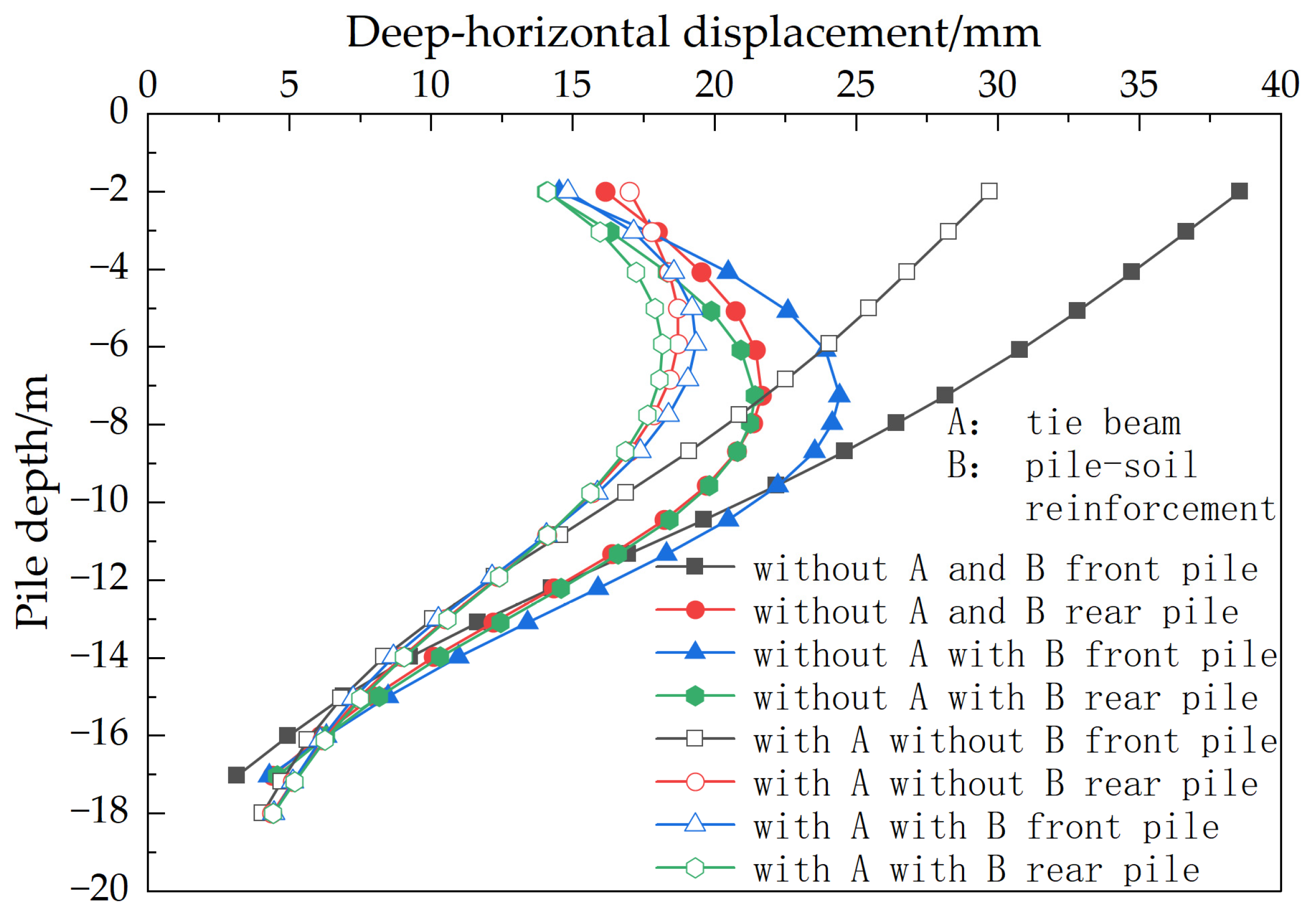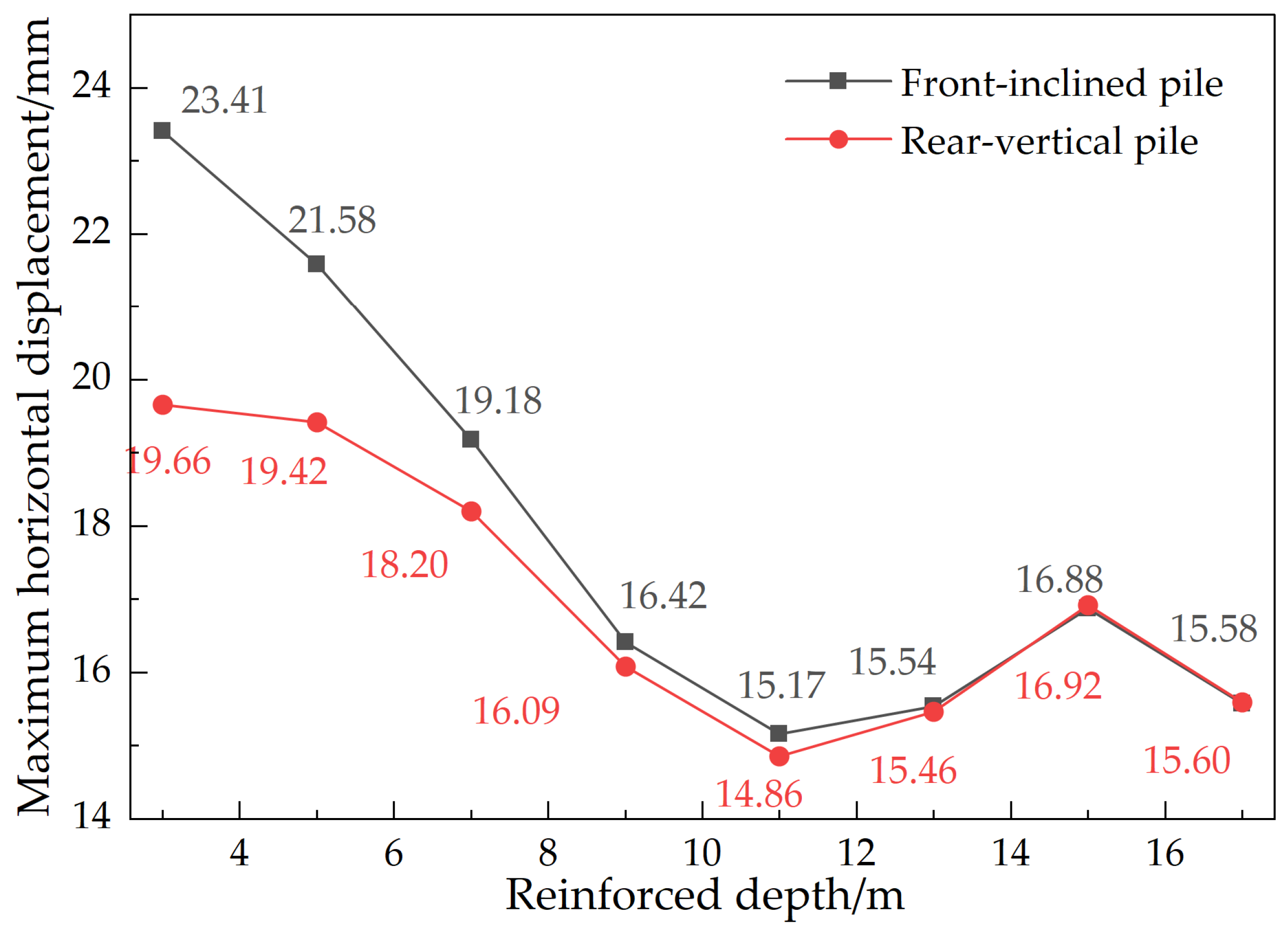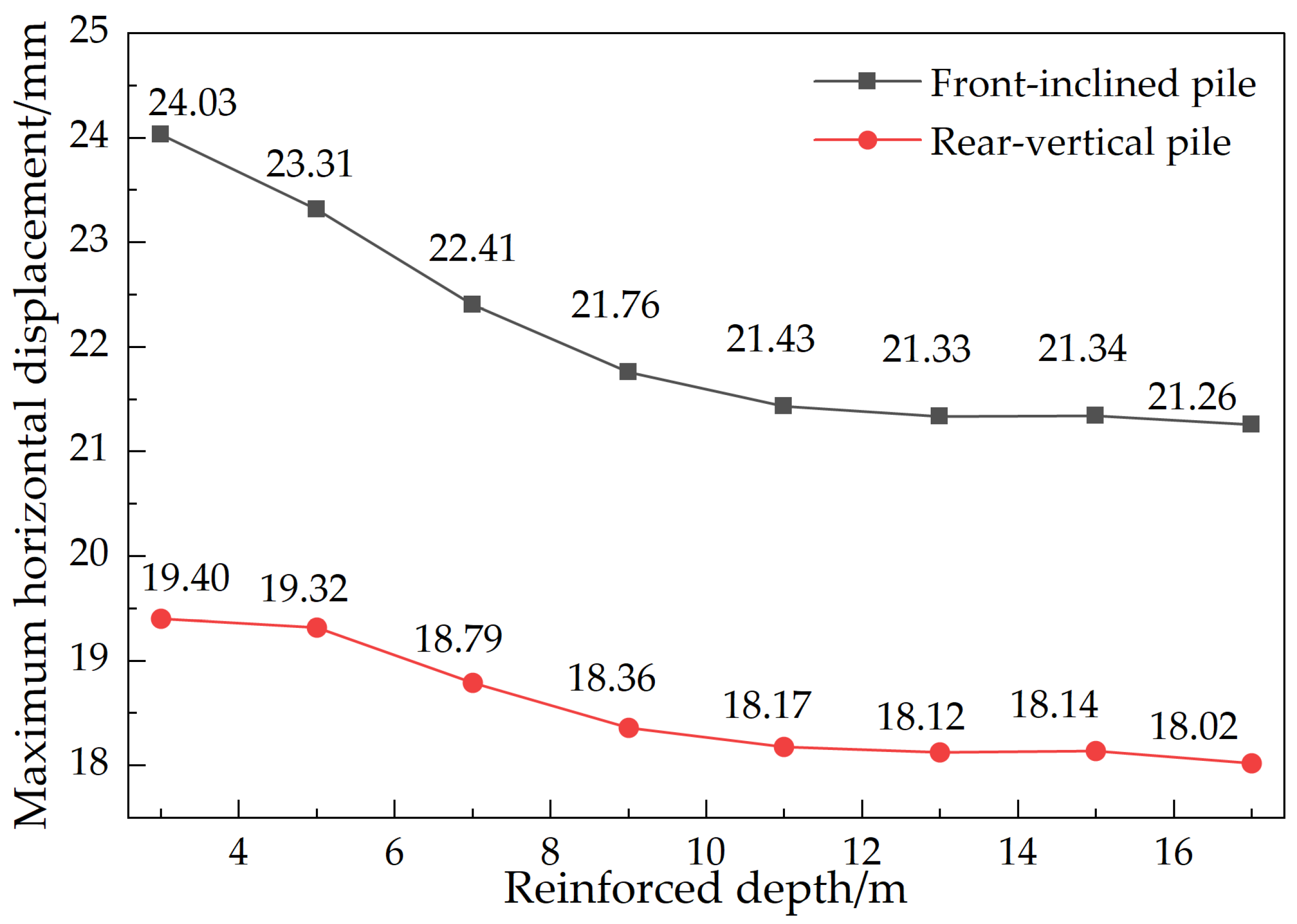 5.2.1. Influence of Reinforcement Depth on Pile Displacement