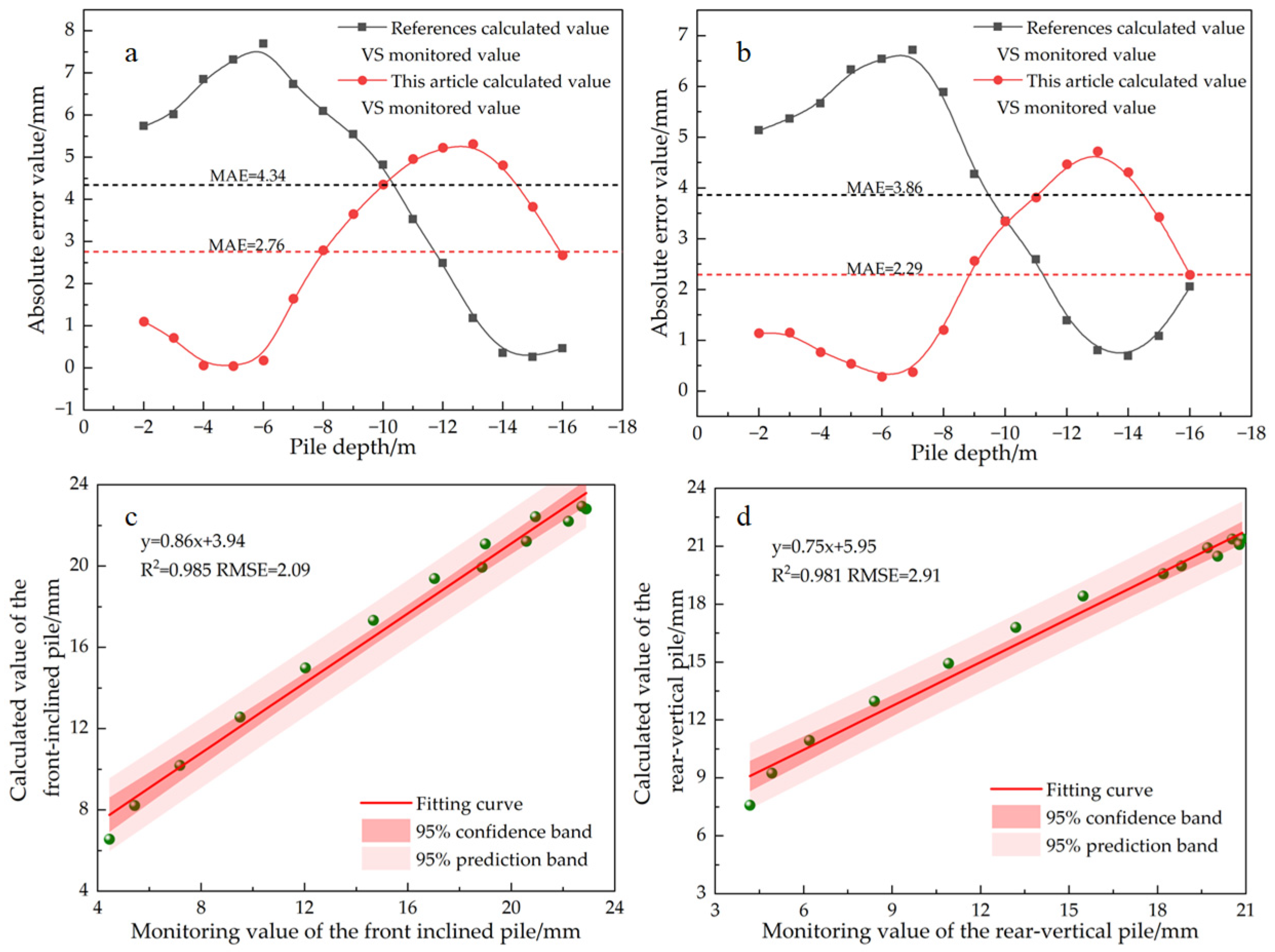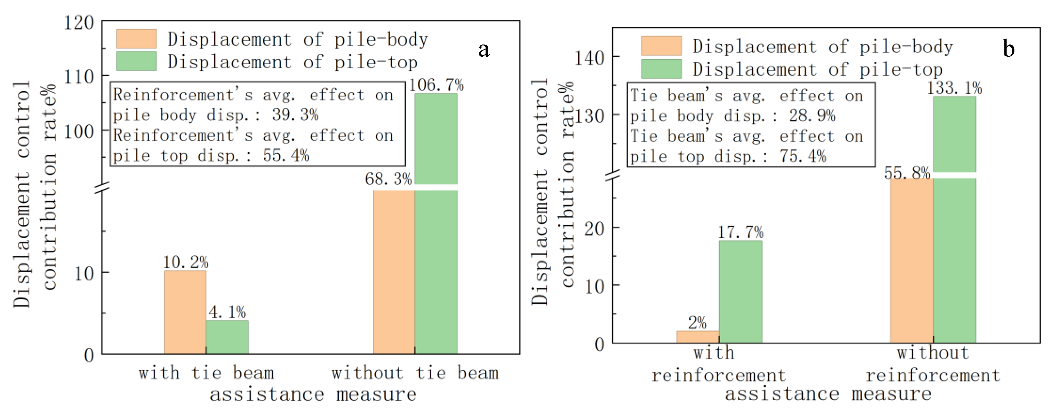 - In the supporting system of double-row piles comprising inclined front piles and vertical rear piles, the soil reinforcement between the piles predominantly controls the overall displacement of the pile body (contribution rate: 39.3%). Conversely, the capping beam at the pile top exerts a more pronounced constraint on the displacement at the pile top (contribution rate: 75.4%). In the event of simultaneous failure of both mechanisms, there is a sharp 50% decrease in lateral resistance, leading to a shift in displacement pattern from the previous “inward convex” distribution resulting from coordinated force-bearing to a “cantilever” distribution under single-pile bearing. This transition underscores the essential nature of the dual constraint mechanism.