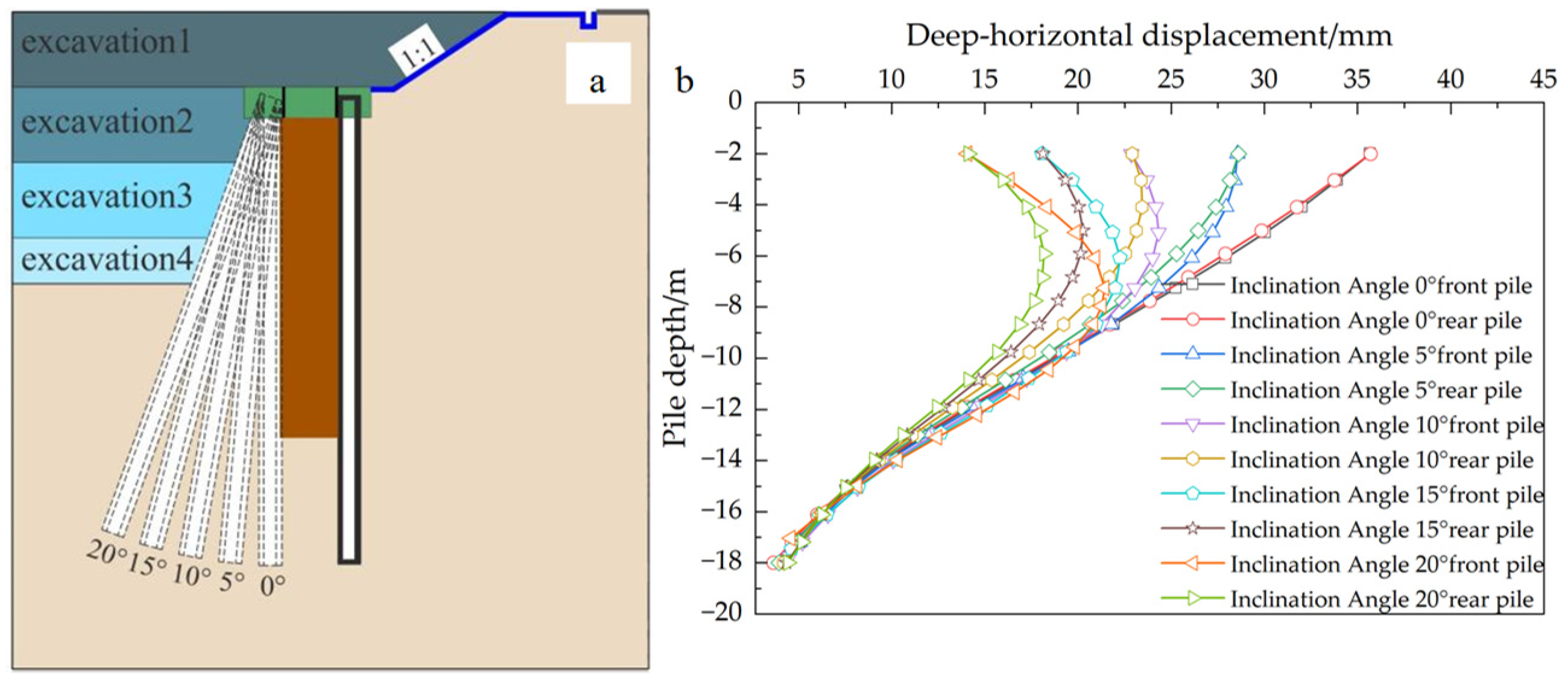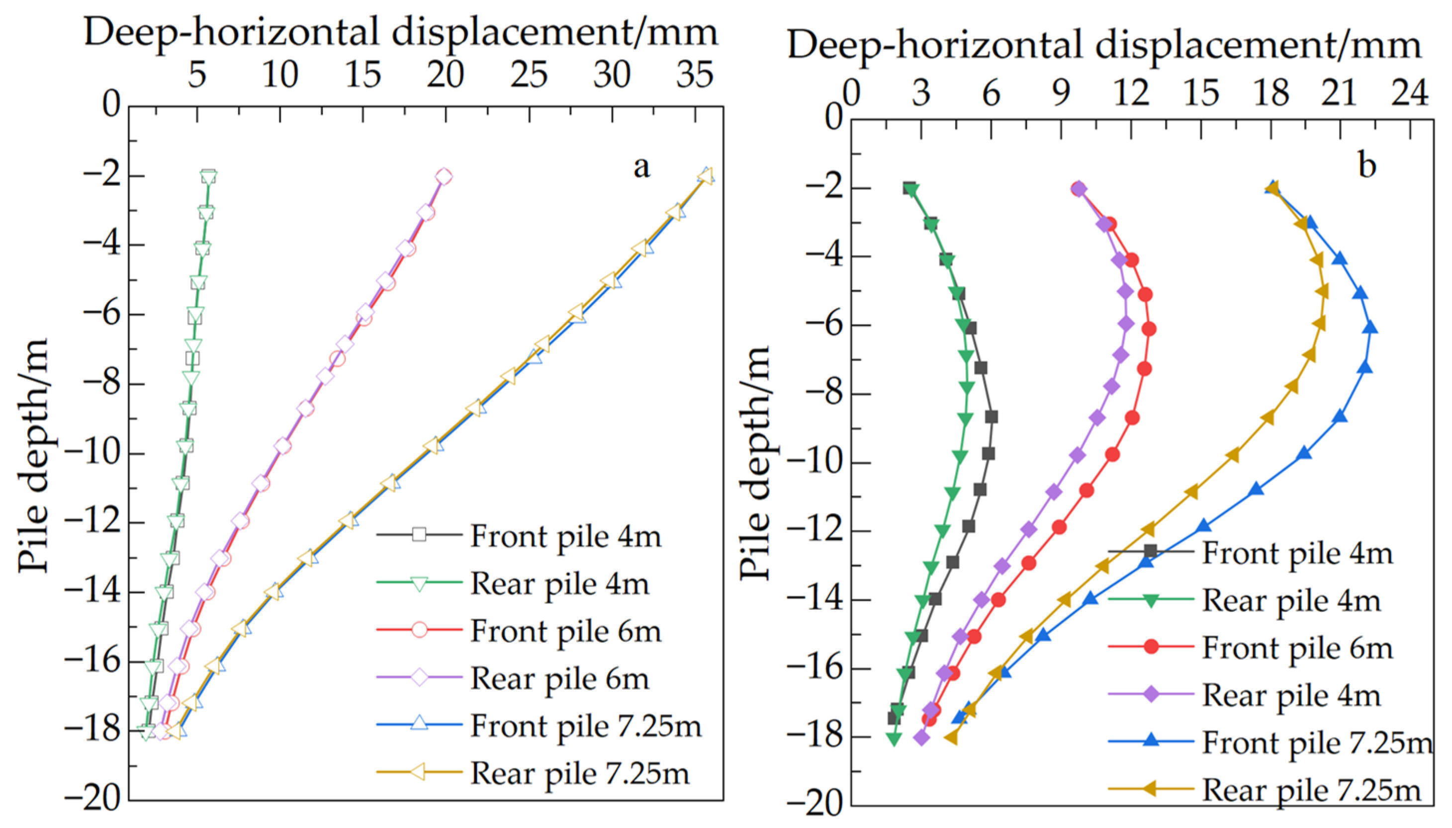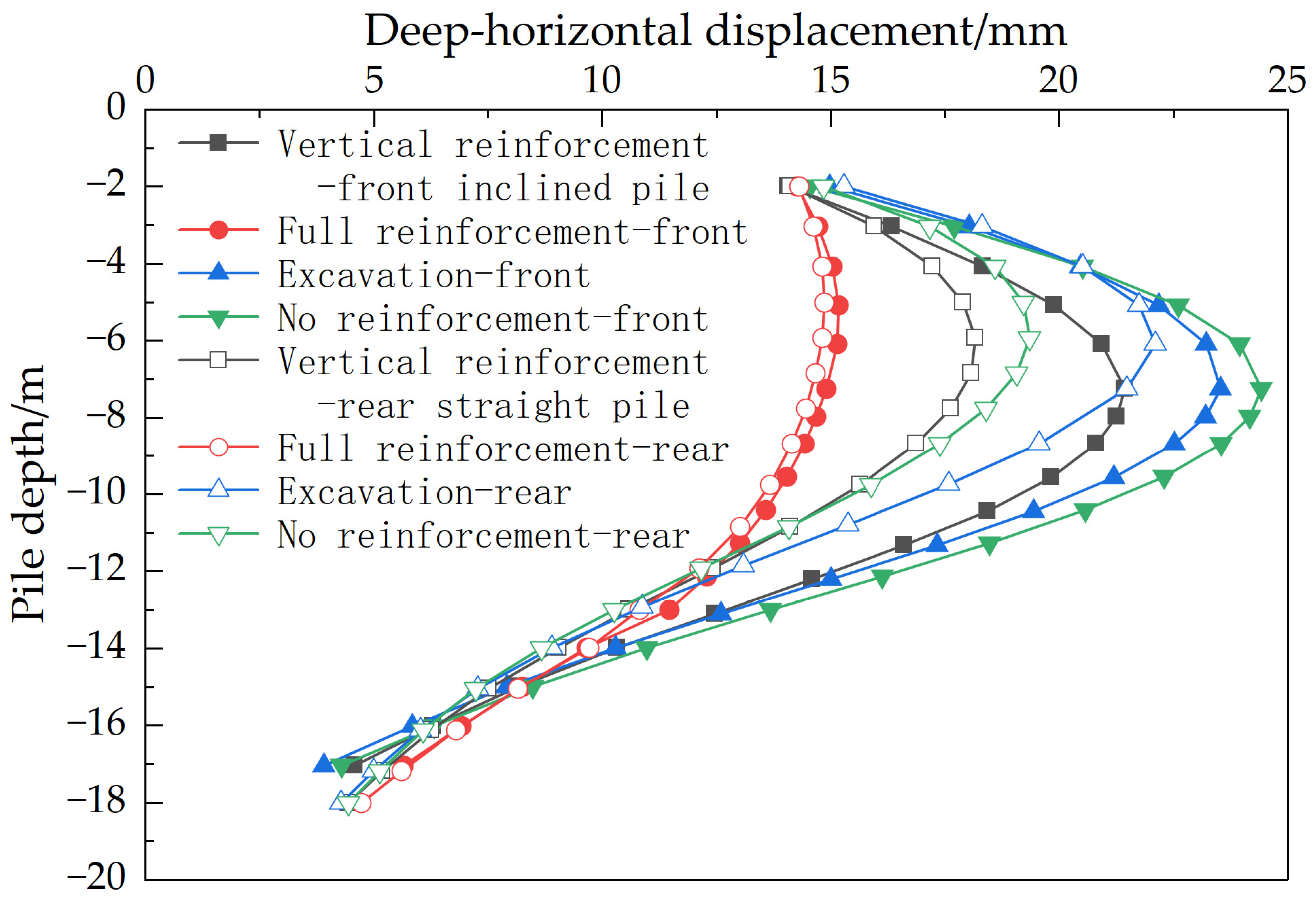 - The displacement distribution of double-row piles, comprising inclined front-row piles and vertical rear-row piles, demonstrates a characteristic deformation resembling an “inward convex drum shape.” Greater inclination angles of the front-row piles enhance the structural deformation control capacity, leading to a pile displacement curve that closely aligns with the pile-brace supporting form’s displacement characteristics.