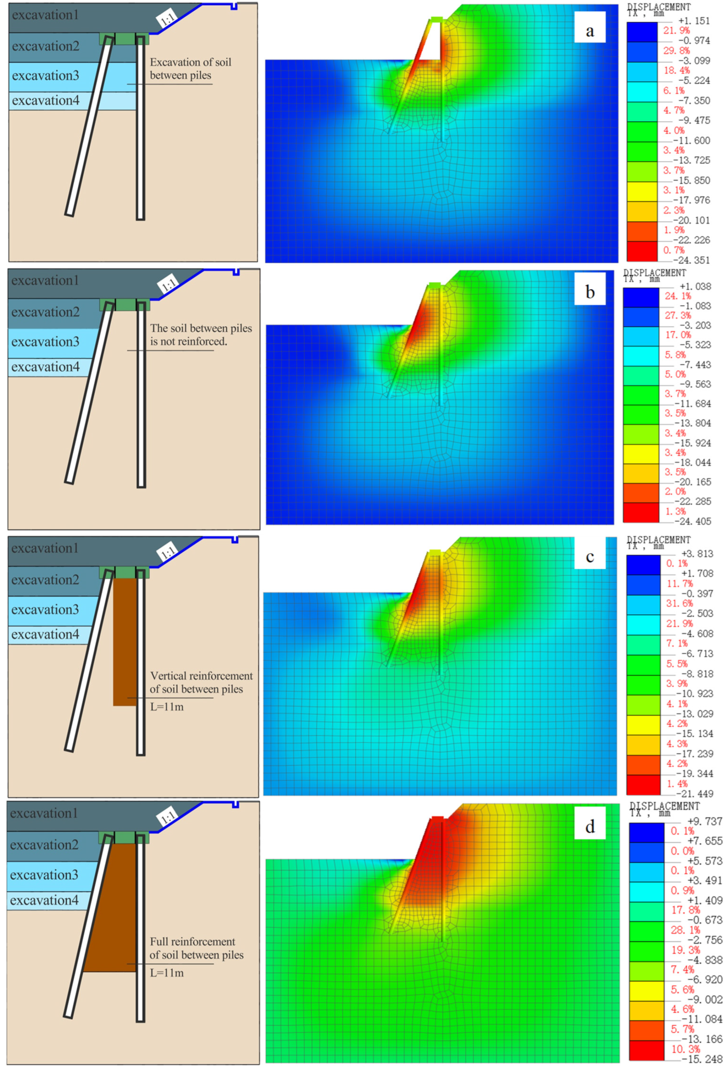 - In practical engineering applications, optimizing the reinforcement depth of the soil between piles is essential. The optimal reinforcement depth is typically established at 1.0 to 1.5 times the excavation depth. For foundation pit projects sensitive to the surrounding environment, full-depth reinforcement is recommended, as it more effectively controls deformation in the vicinity. The elastic modulus of the added solid should be set between 200 and 300 MPa. This range facilitates a balance among displacement control, engineering economy, and risk management within the stiffness mutation zone.