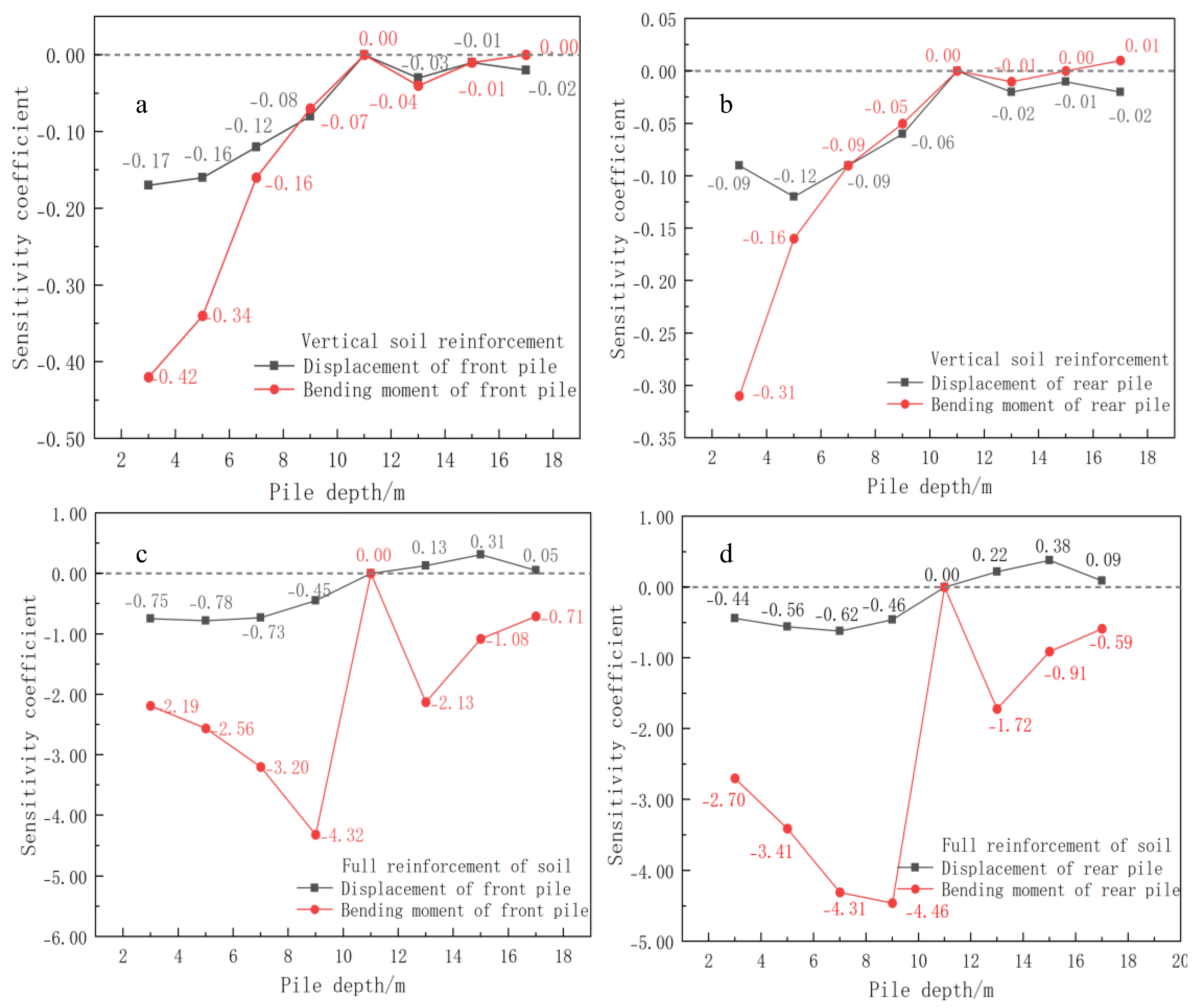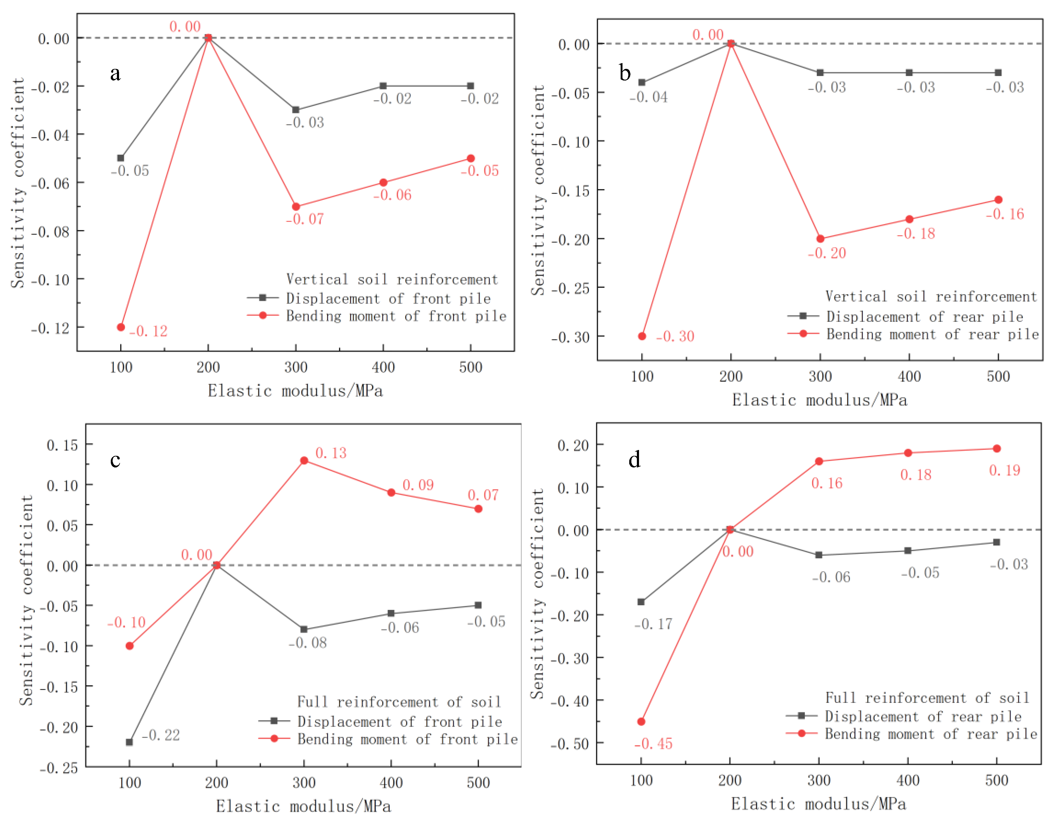 - The sensitivity of reinforcement depth to pile displacement and bending moment is significantly higher than that of elastic modulus, and the sensitivity strength under full reinforcement conditions is generally greater than that under semi-reinforcement conditions.