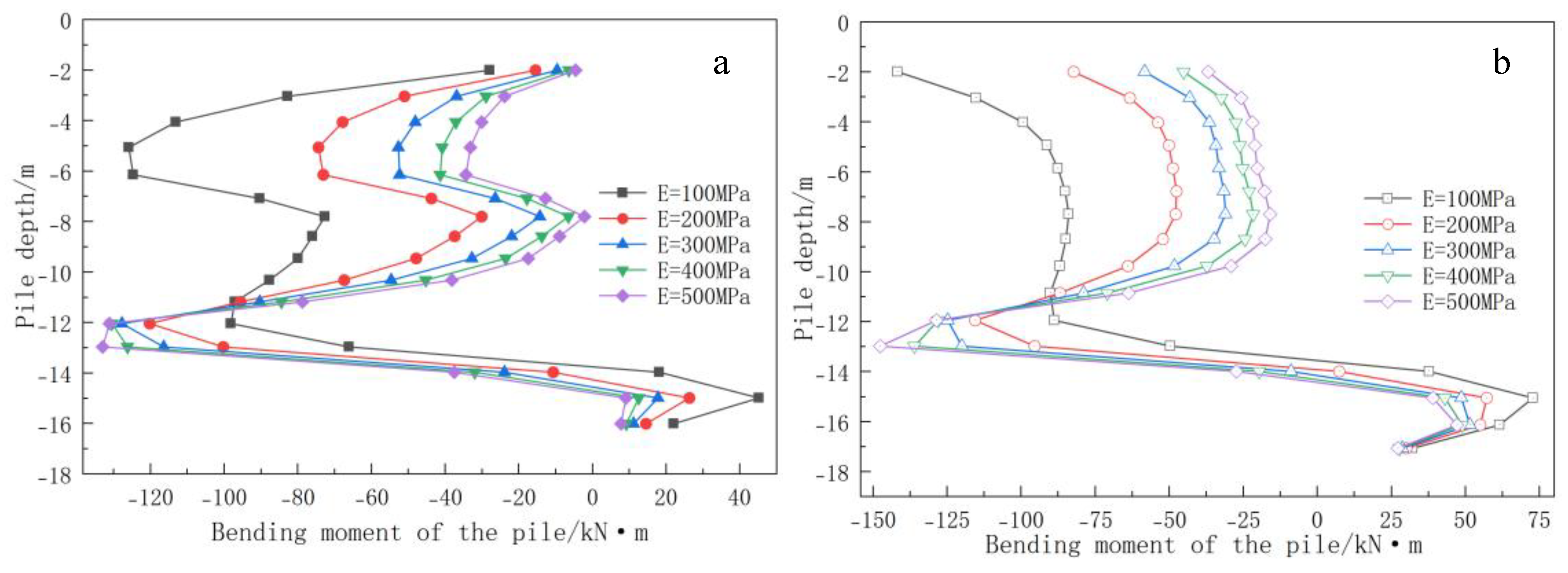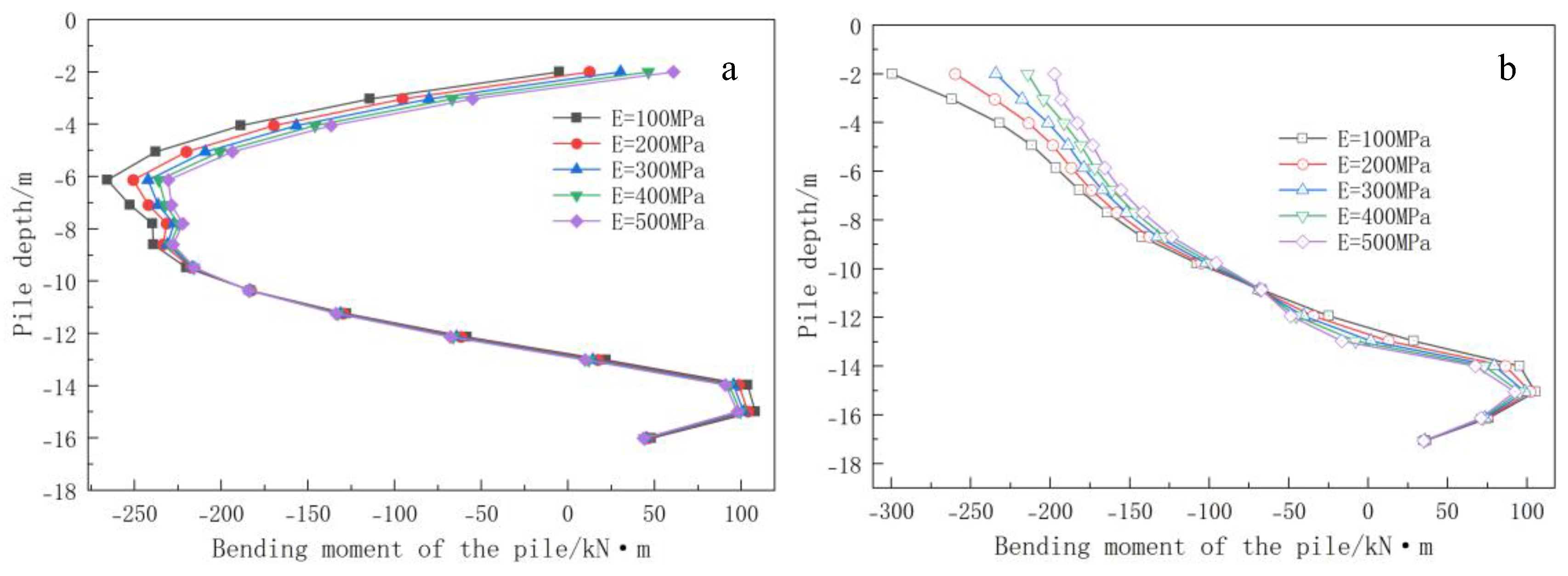 5.4.2. Influence of Elastic Modulus on the Bending Moment of the Pile Shaft