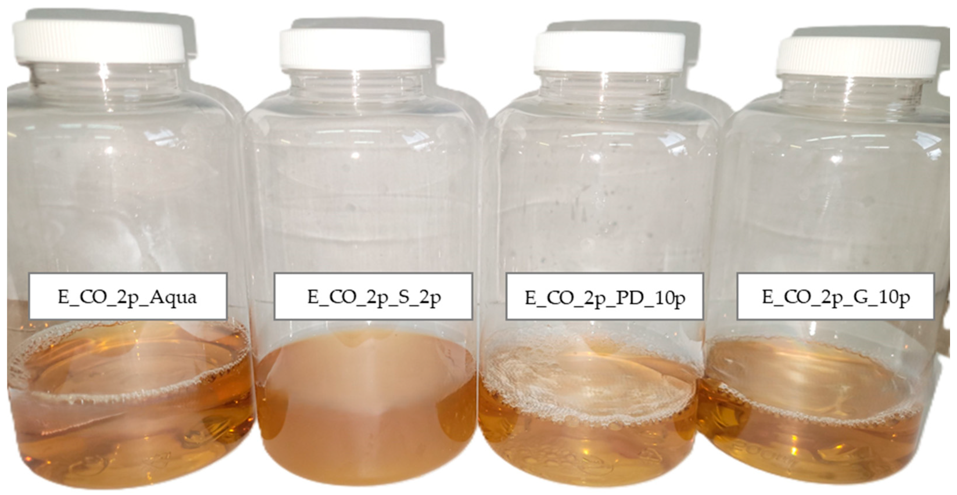 First, a formula for a facial serum was developed (Table 1). Then the extraction media were “borrowed” from the cosmetic formulation and used directly during extraction. The resulting extracts were incorporated into the final serum, achieving a high extract content of 50%. The formulations were labeled based on the extraction medium: FS_E_50p_Aqua (water), FS_E_50p_G (aqueous glycerin solution), FS_E_50p_PD (aqueous 1,3-propanediol solution), and FS_E_50p_S (surfactant solution). A control serum without extract was designated FS_E_0p.