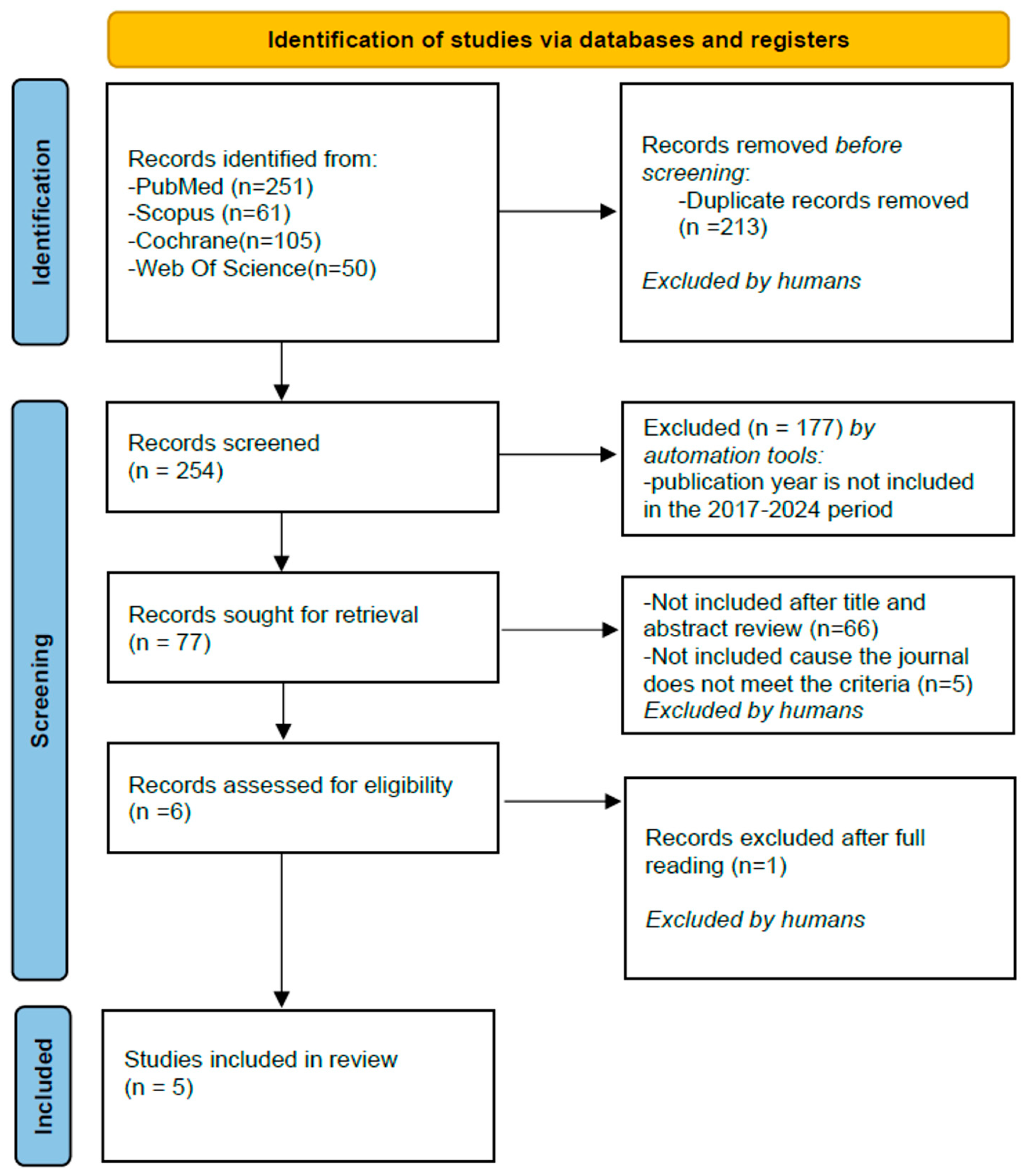 - Cumpston, M.; Li, T.; Page, M.J.; Chandler, J.; Welch, V.A.; Higgins, J.P.; Thomas, J. Updated guidance for trusted systematic reviews: A new edition of the Cochrane Handbook for Systematic Reviews of Interventions. Cochrane Database Syst. Rev. 2019, 10, ED000142. [Google Scholar] [CrossRef] [PubMed]