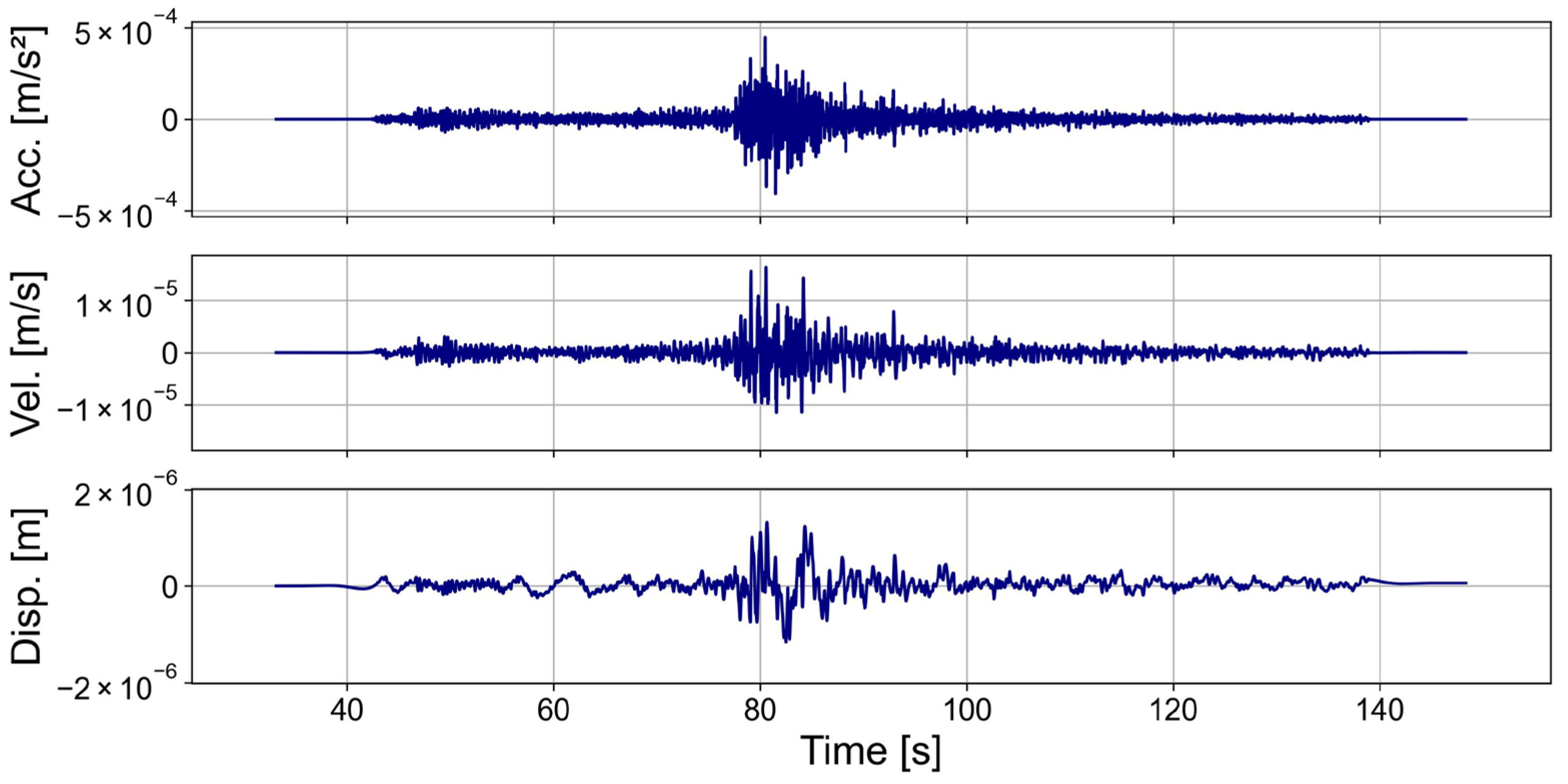 - Baseline Correction: The filtered acceleration time history is twice integrated to compute the displacement time history. A 6th-order polynomial regression, with the 0th and 1st orders constrained to zero, is then fitted to the displacement. The fitted curve is then twice differentiated and subtracted from the original acceleration time history. Finally, the corrected acceleration is again twice integrated to verify that the displacement time history converges toward zero, confirming the adequacy of the baseline correction.
