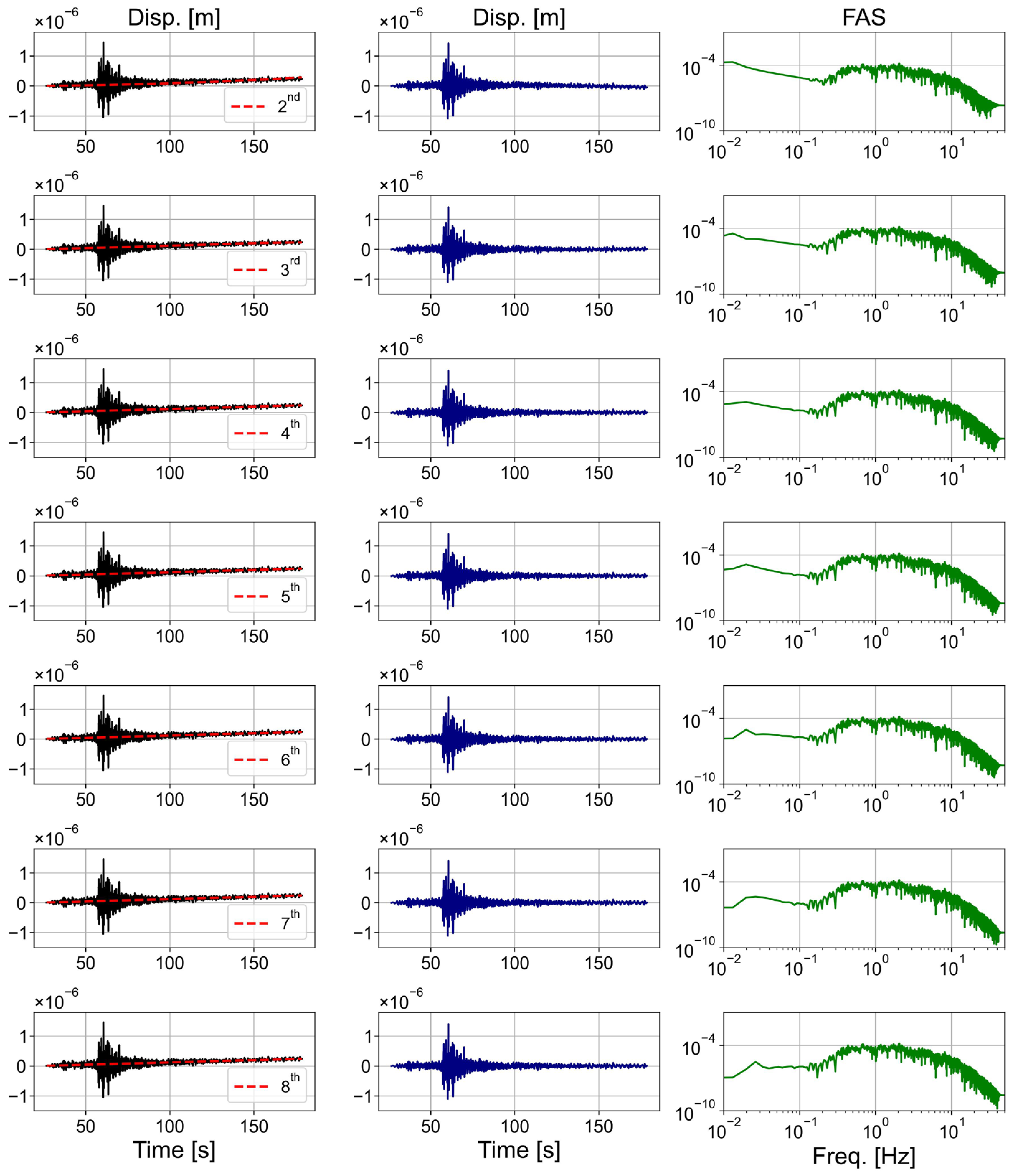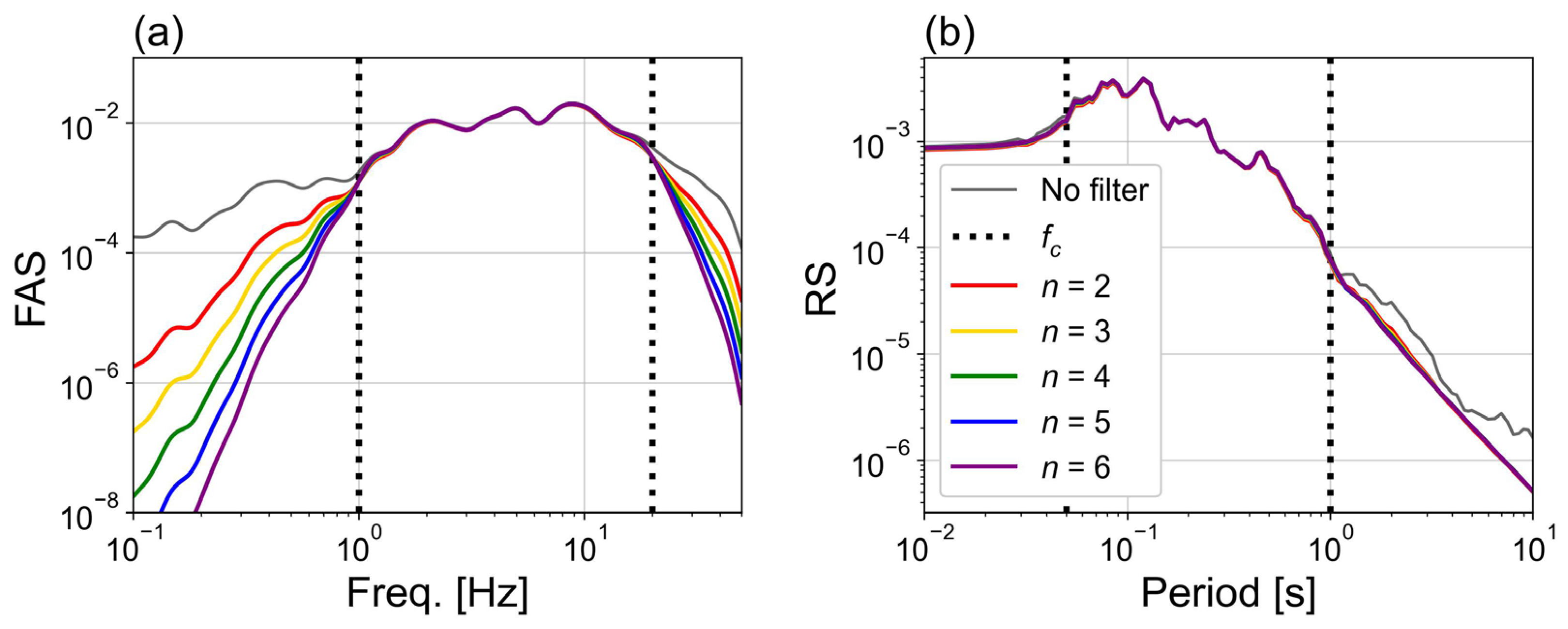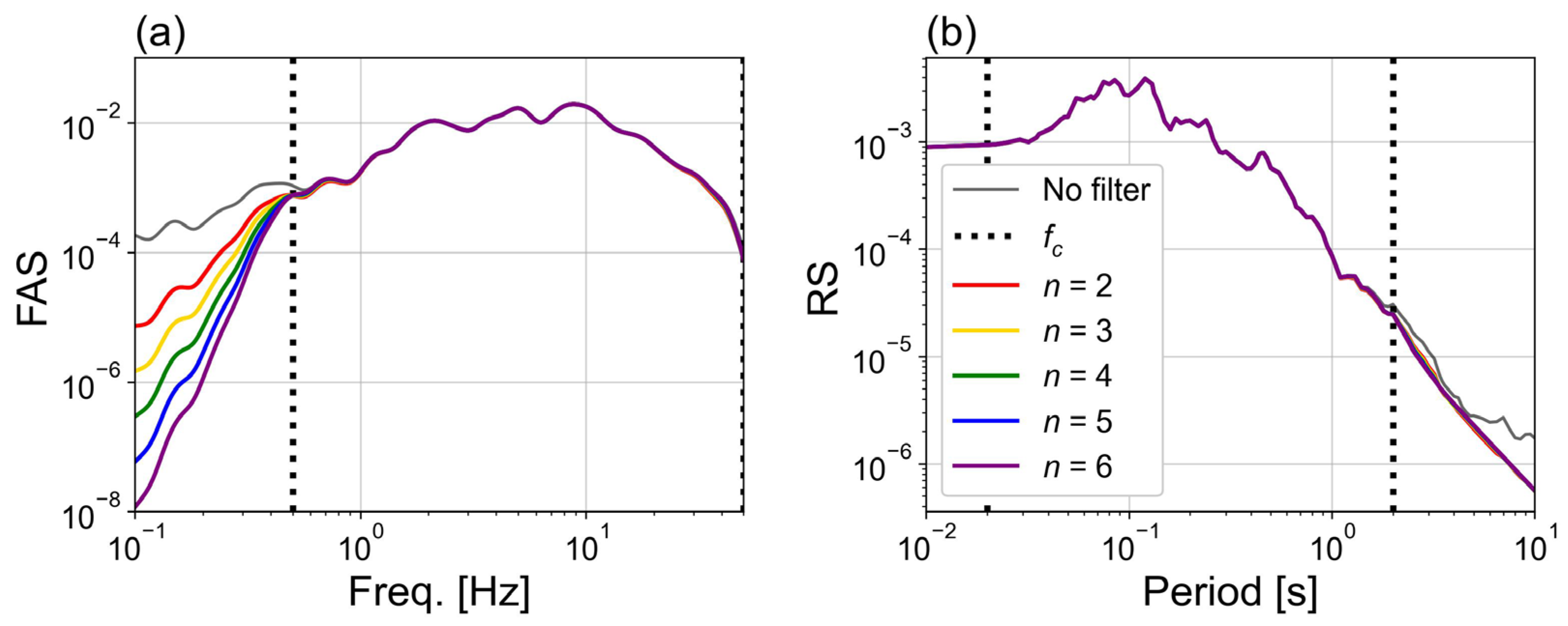 - Filtering: The application of the ABF showed that increasing the filter order not only enhances noise suppression outside the corner frequency range but also increases waveform distortion near the filter boundaries. A higher high-pass corner frequency leads to a greater reduction in the long-period range of the RS. However, varying the filter order from 2 to 6 had negligible effects on the RS.
