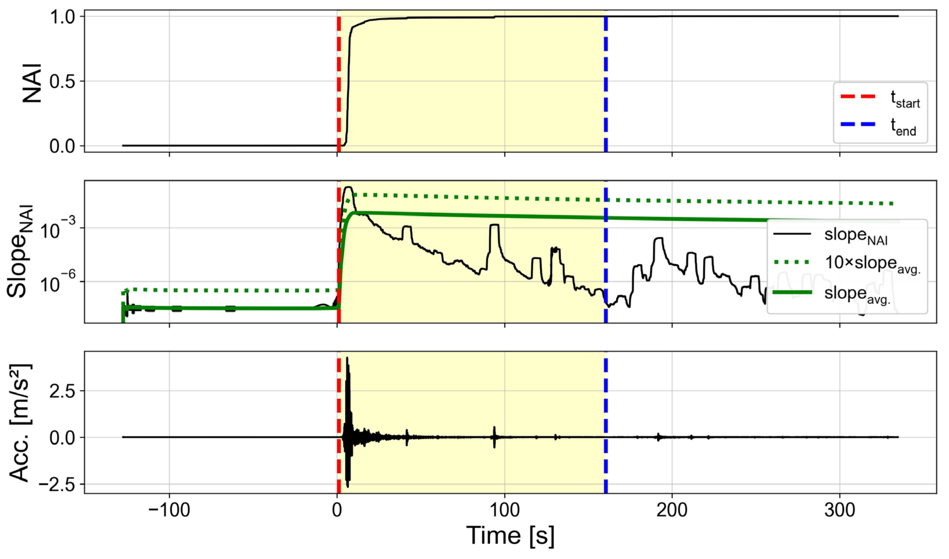 - Start time: Identify the first time point where the slope of the smoothed NAI exceeds ten times the average slope observed from the record’s beginning up to that point. Smoothing is performed using a moving average over a ±2.5 s window, and slope inspection begins 10 s after the initial time.